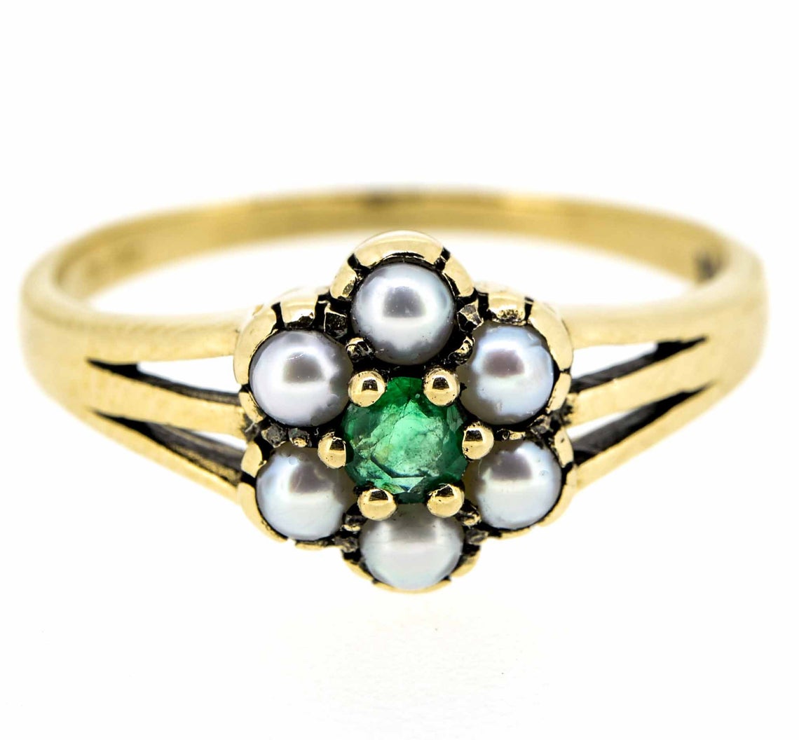 9ct Yellow Gold Antique Style Emerald & Seed Pearl Cluster Ring