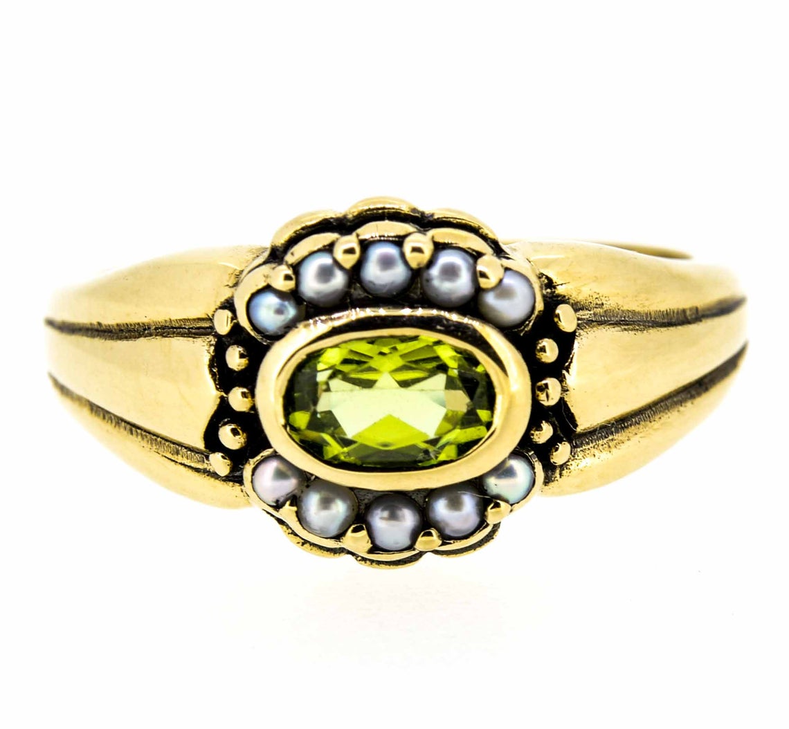 9ct Yellow Gold Antique Style Peridot and Seed Pearl Dress Ring