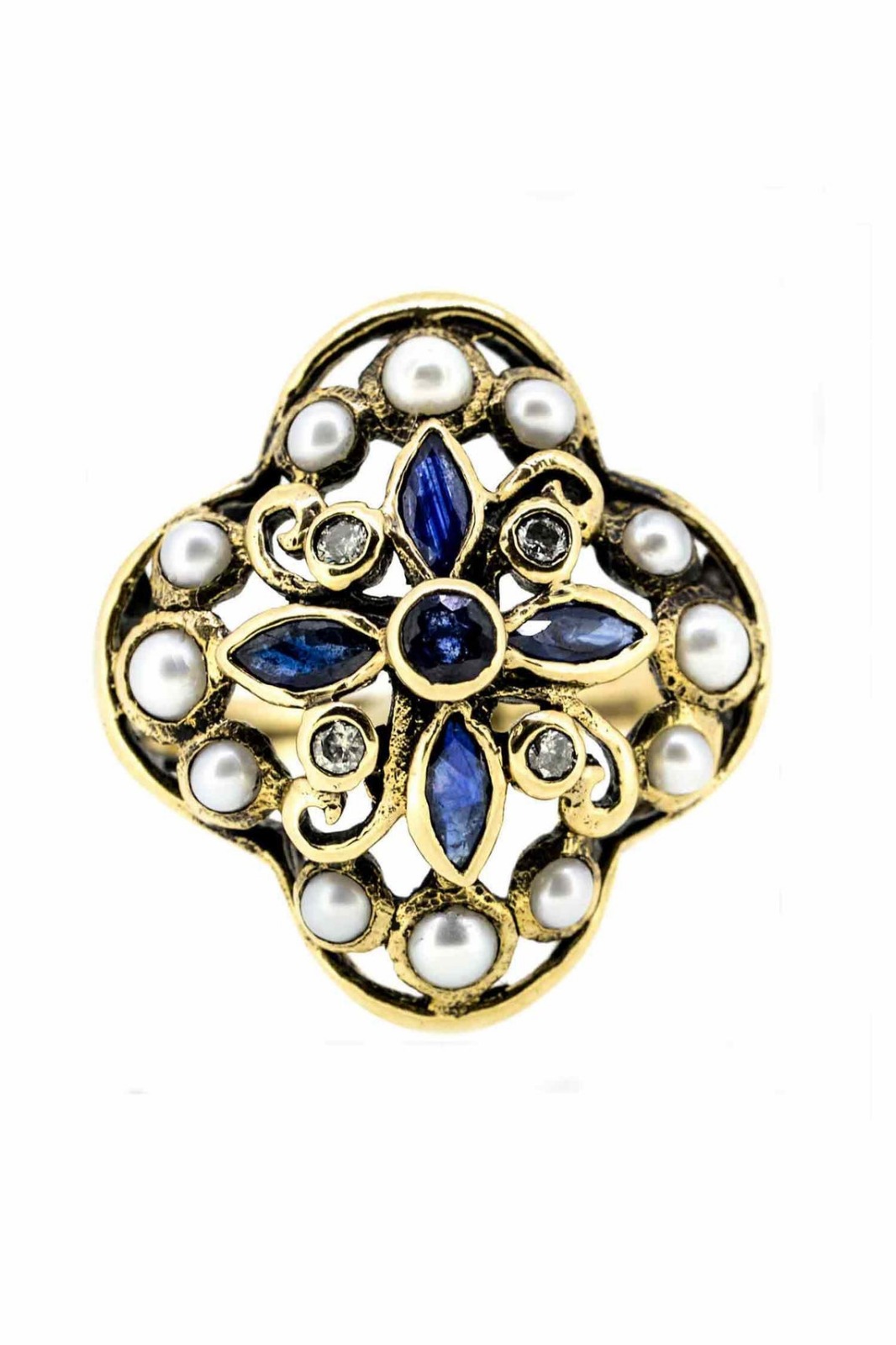 9ct Yellow Gold Antique Style Sapphire, Diamond & Pearl Ring