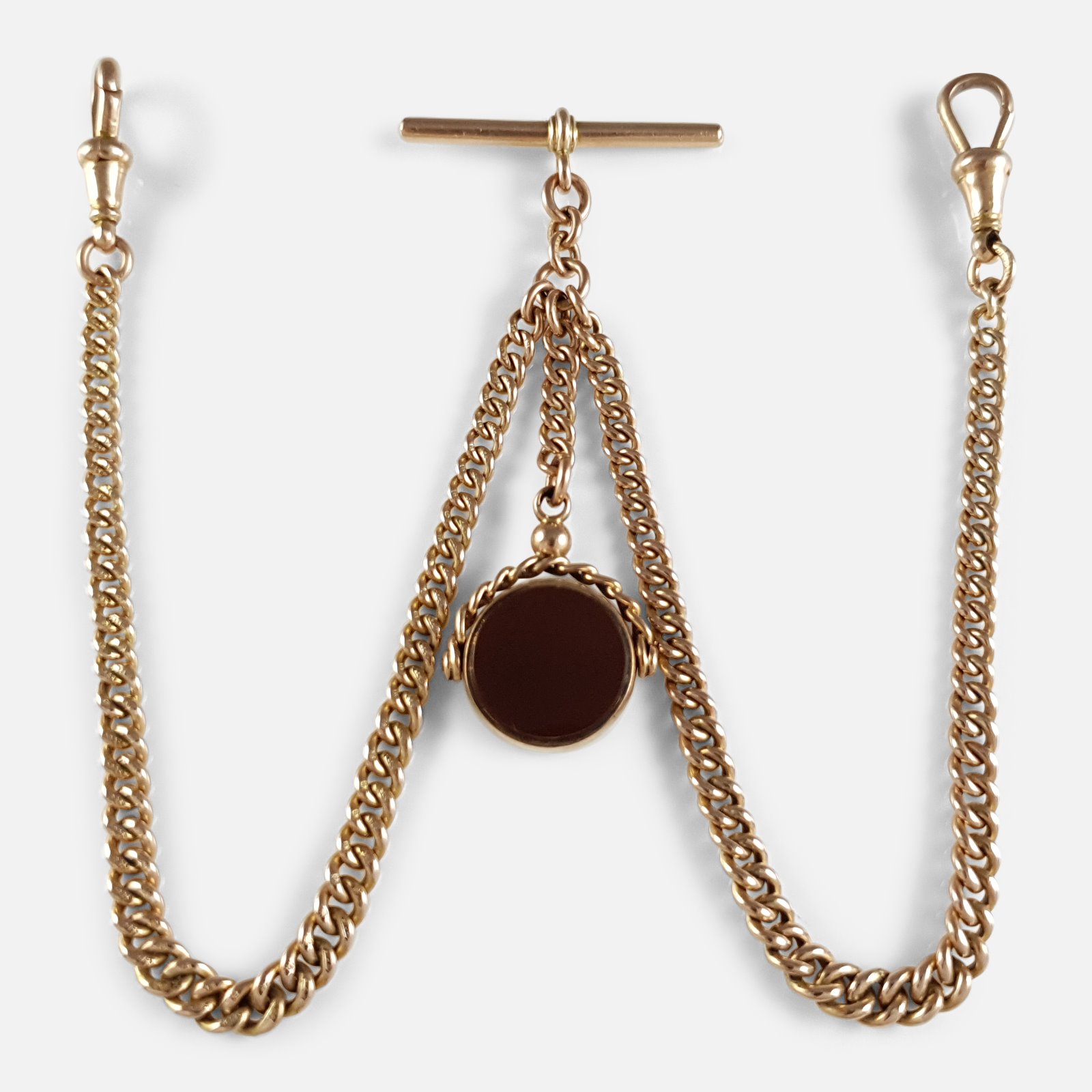 9ct Yellow Gold Double Albert Watch Chain with Bloodstone & Carnelian Fob 28.0g