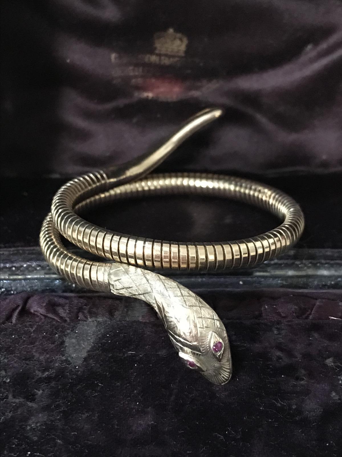 9ct Yellow Gold Expandable Ladies Bangle or Bracelet, Designed as a Coiled Snake or Serpent, Set with Ruby Eyes
