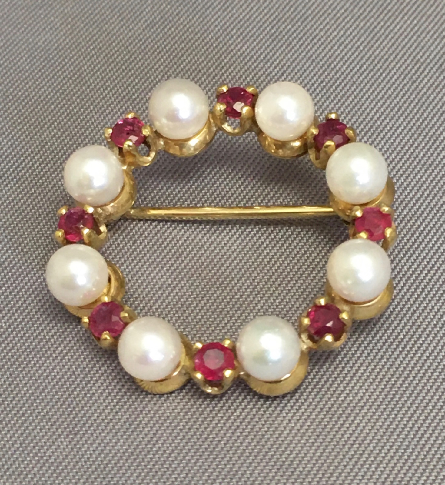 9ct Yellow Gold Ruby & Pearl Brooch - London 1985