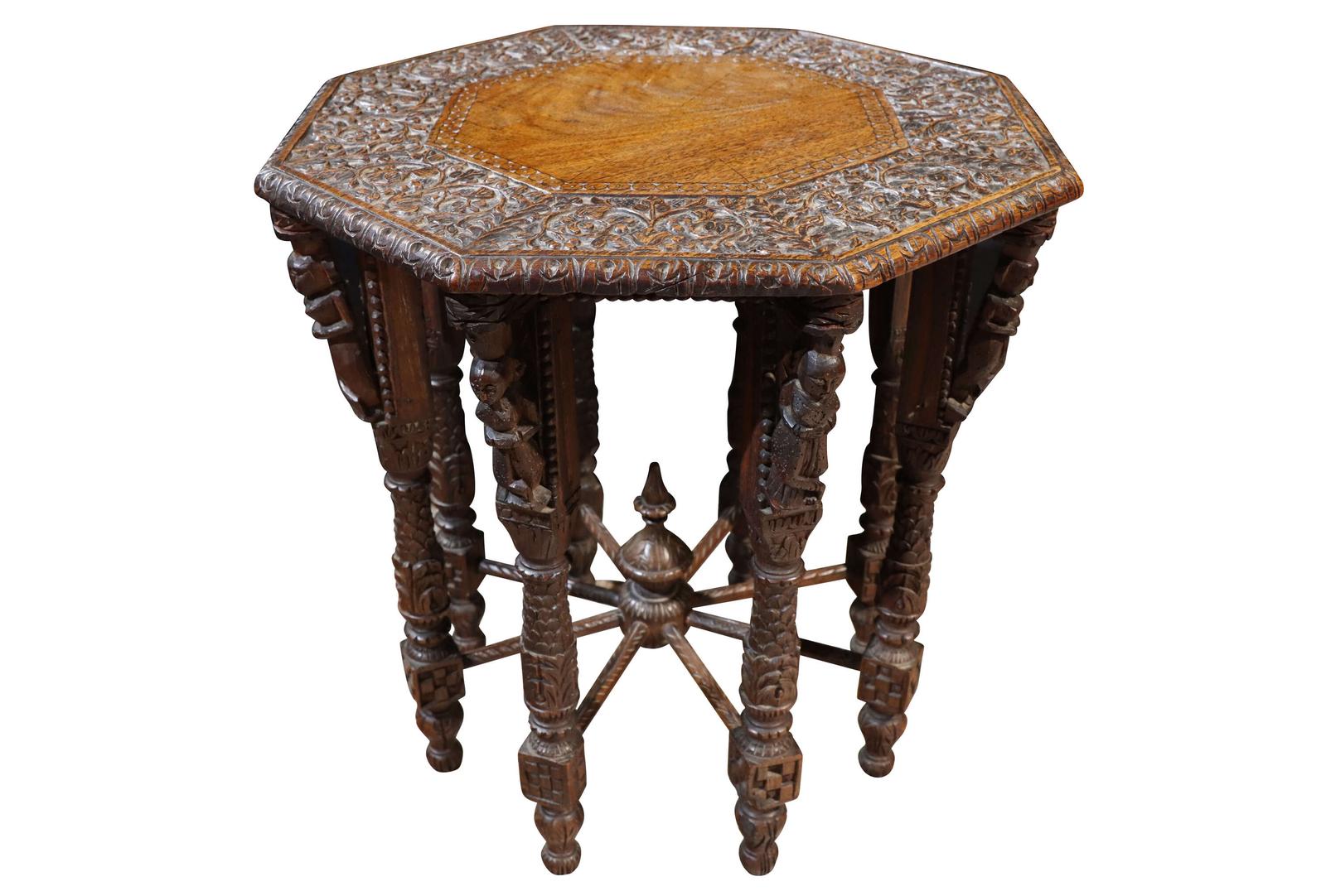 A striking 19th-century Anglo-Indian carved hardwood table, richly decorated with dense and intricate carving throughout. The octagonal top is finely worked with scrolling foliate motifs surrounding a central plain panel, framed by a deeply carved border with excellent depth and definition. Beneath, the table is supported on multiple turned and carved legs, each enriched with figural and geometric detailing, united by radiating stretchers centred on a turned finial, creating both structural strength and visual drama. The carving is bold and exuberant, typical of Anglo-Indian furniture produced for the British colonial market, where craftsmanship and ornamentation were prized. The rich patina and colour of the hardwood enhance the depth of the carving and speak to its age and quality. Dating to the mid–late 19th century (circa 1860–1890), this table would make an impressive occasional table, lamp table, or statement piece in a layered interior, equally at home in a traditional setting or as a contrast within a more eclectic scheme.