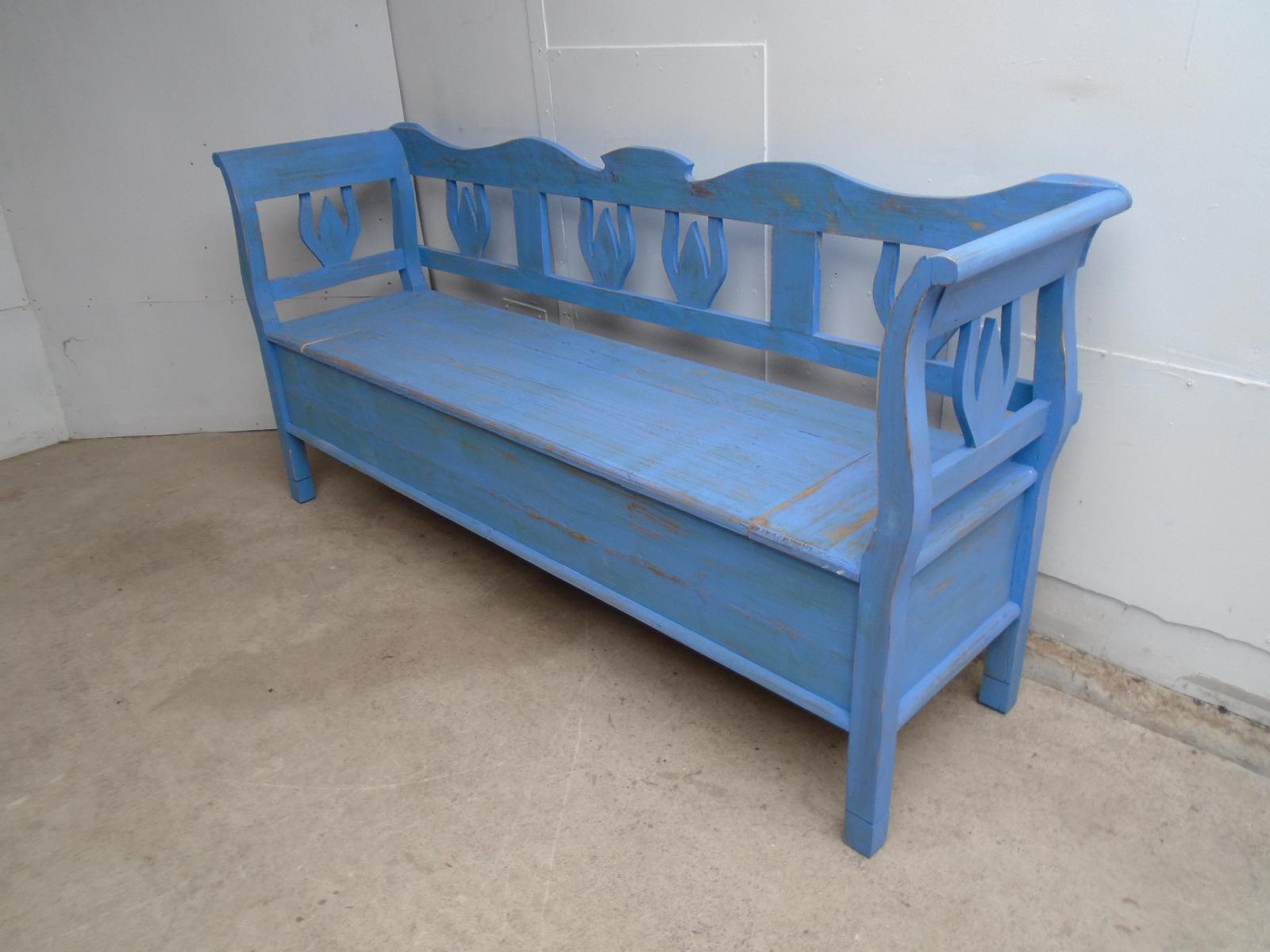 A 3 Seater Shabby Chic Pine Painted Tulip Blue & Green Box Settle / Hall Bench