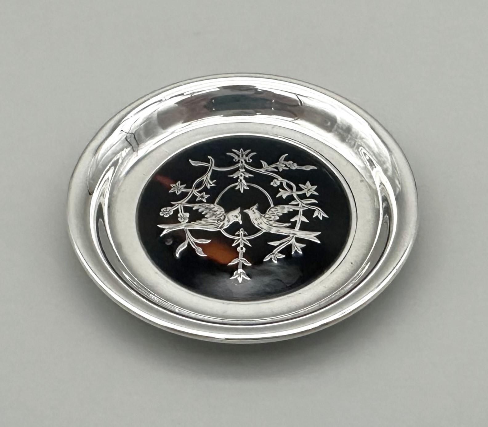 A beautiful silver trinket or pin dish by the great maker of William Comyns. This lovely round example sits on a small raised base with flared sides and a turned over, folded rim. To the centre is a wonderful tortoiseshell panel with gorgeous piquet work featuring naturalistic motifs and two birds-of-paradise. A decorative piece and great gift idea.