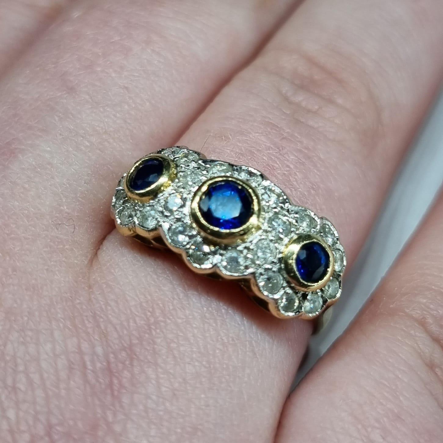 A Beautiful Victorian/edwardian 18ct Gold Ring Set with 3 Sapphires, Surrounded by Diamonds