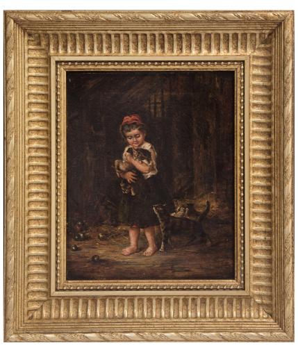 A Charming 19thc Oil on Canvas - Girl with Kittens