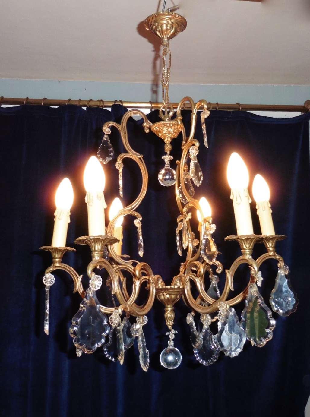 A Charming French Cut Glass 6 Branch Brass Chandelier c.1920