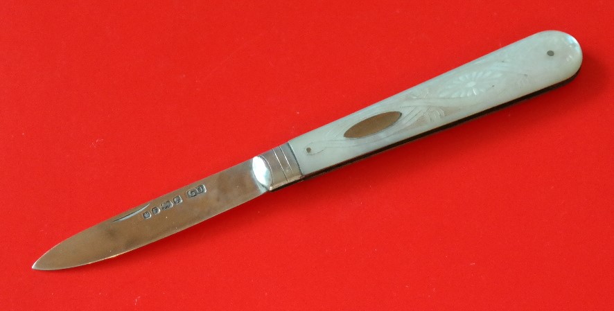 A Circa:- 1873 Silver Mother of Pearl Sheffield Folding Fruit Knife (1 of 1)