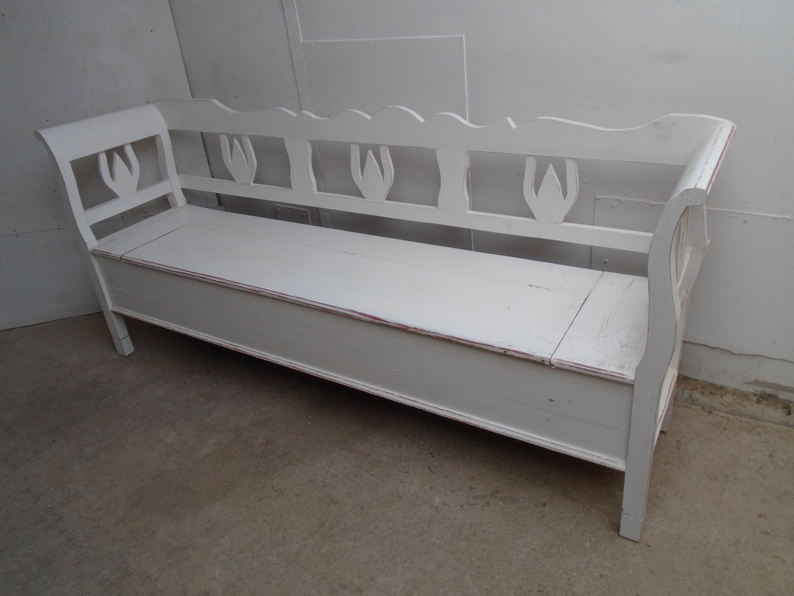 A Cracking Painted White Antique / Old Pine 3 / 4 Seater Box Settle / Bench