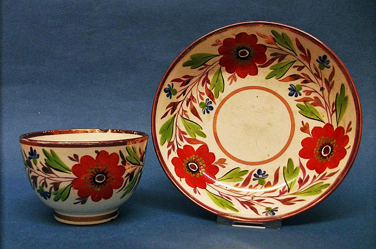 A Creamware Tea Bowl and Saucer with Lustre and Enamel Decoration, C.1800