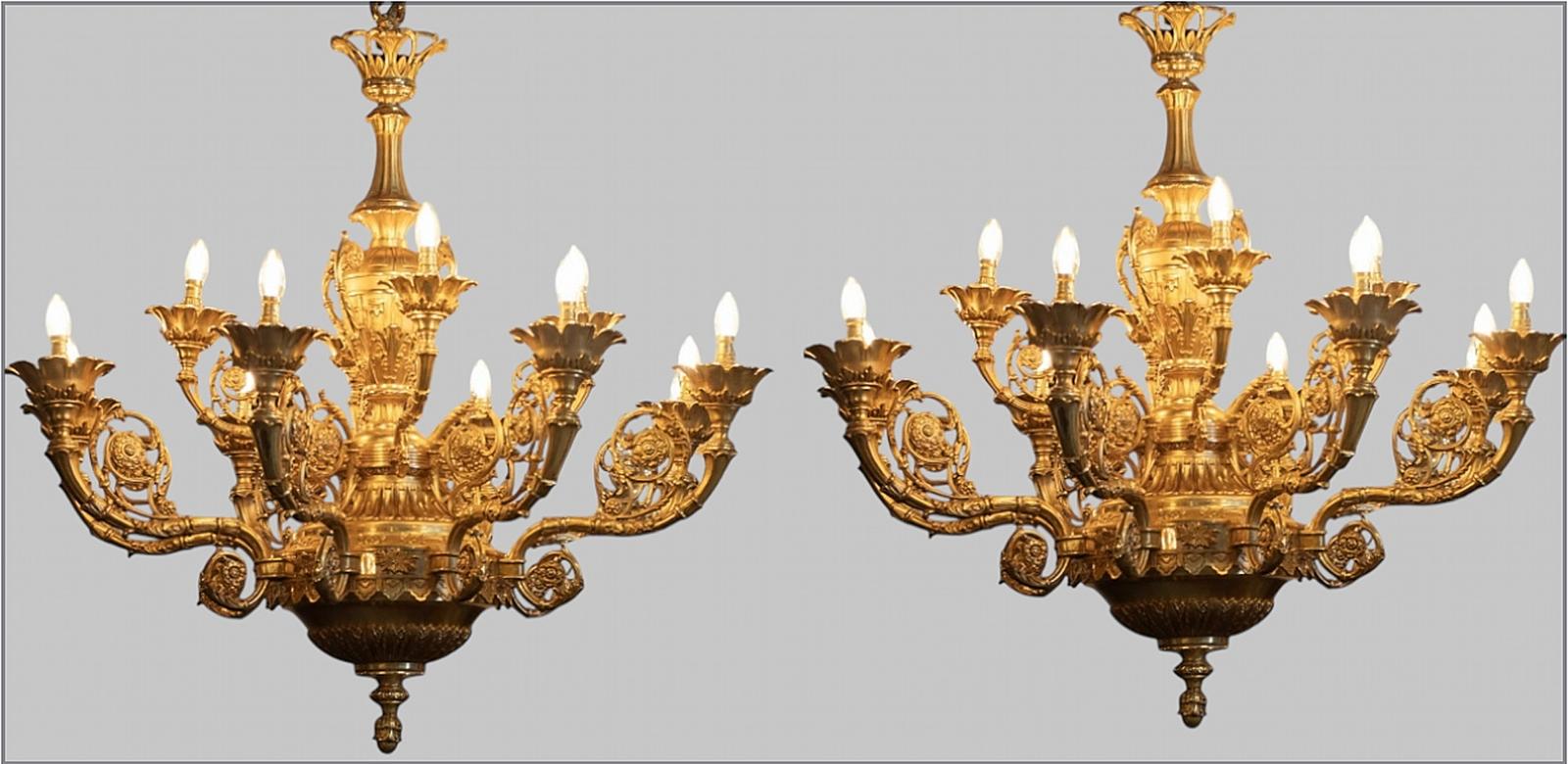 A Fabulous Impressive Pair of C1940 Gold Plated Chandeliers