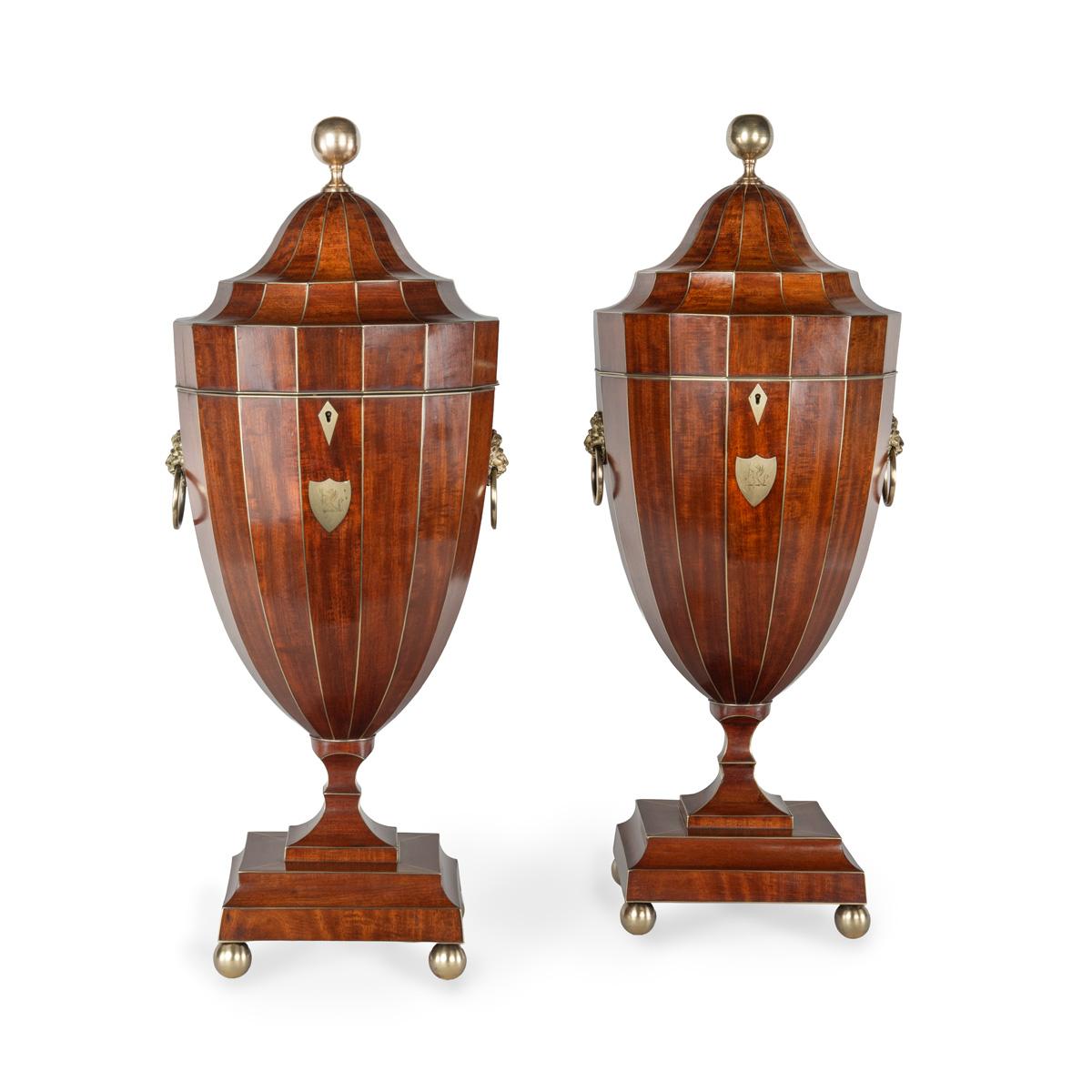 A Fine Pair of Brass Strung Mahogany Knife Urns with Armorials, Likely for the Wills Family of Landrake in Cornwall c.1800