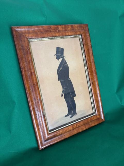 A fine English silohouette of a Gentleman wearing a top hat & holding a glove, highlighted in gold, contained in original maple frame.