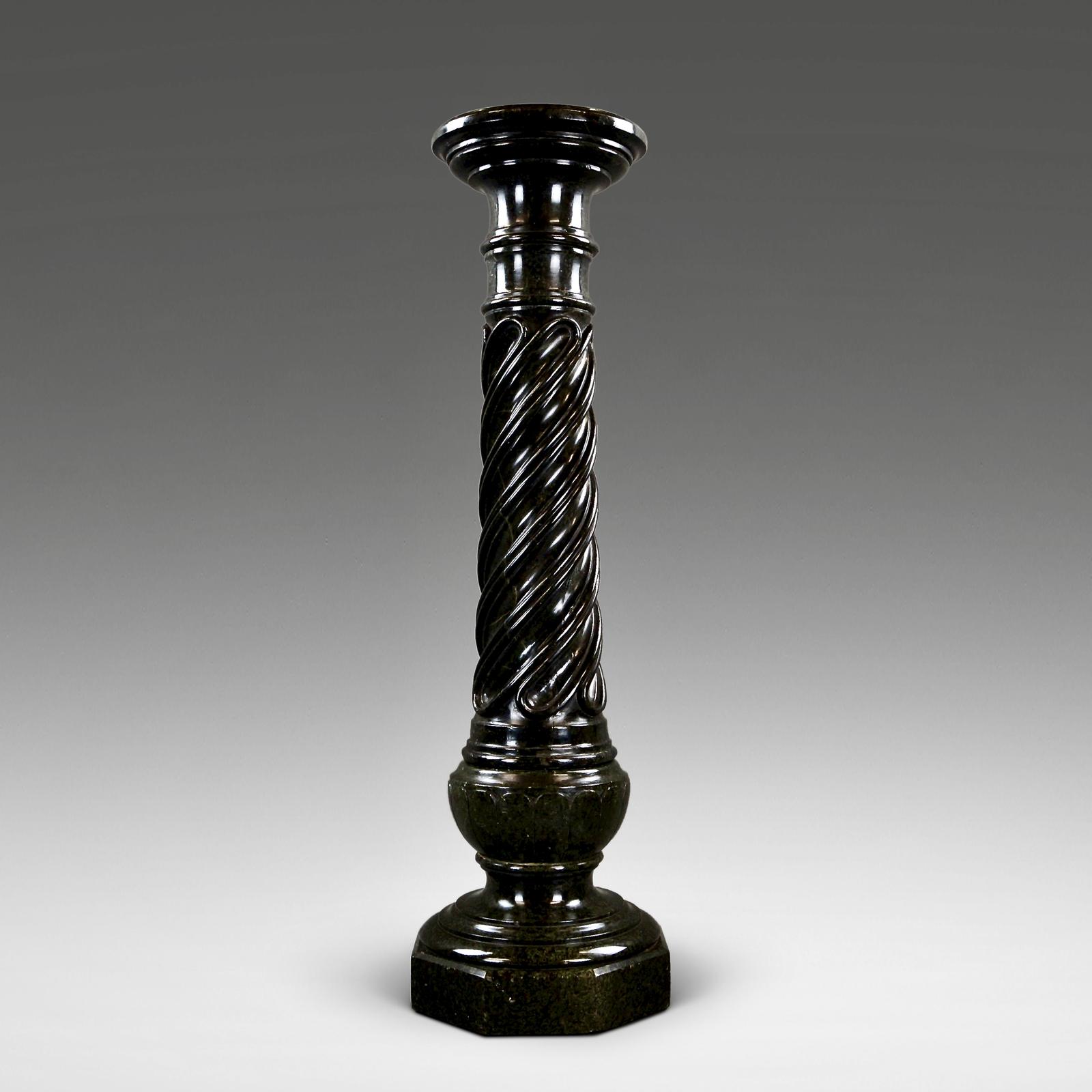 A French mid 19th century Verde Antico Marble column. The column consists of a circular turned top with a molded edge with carved spiral twist column below leading down to a baluster support with circular molded edge all supported on an octagonal base. In very good condition. 1090mm high, 320mm wide and 320mm deep. French. Circa 1860.