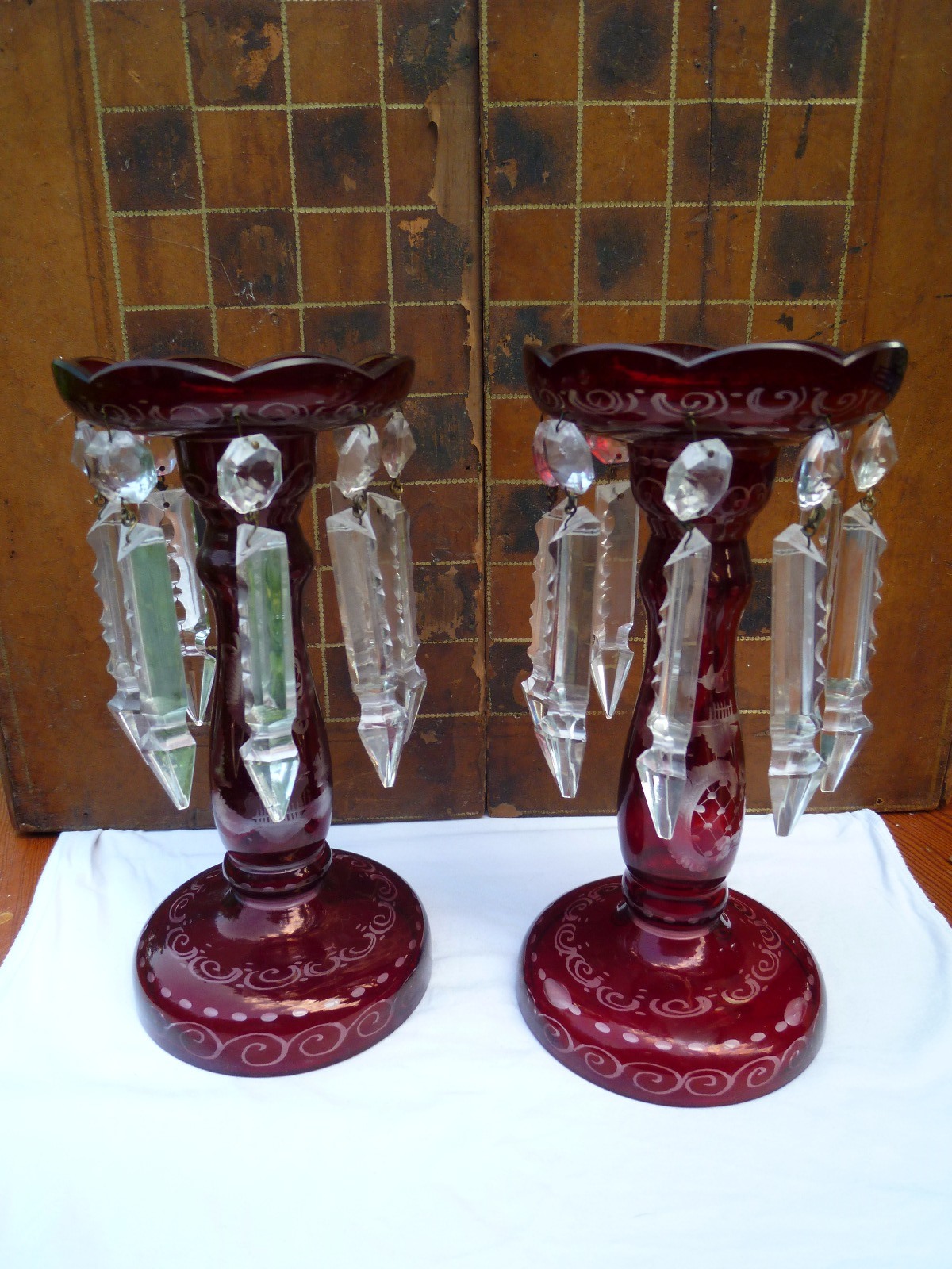 A Good Quality Pair of Cranberry / Ruby Glass Lustres, Candle Sticks