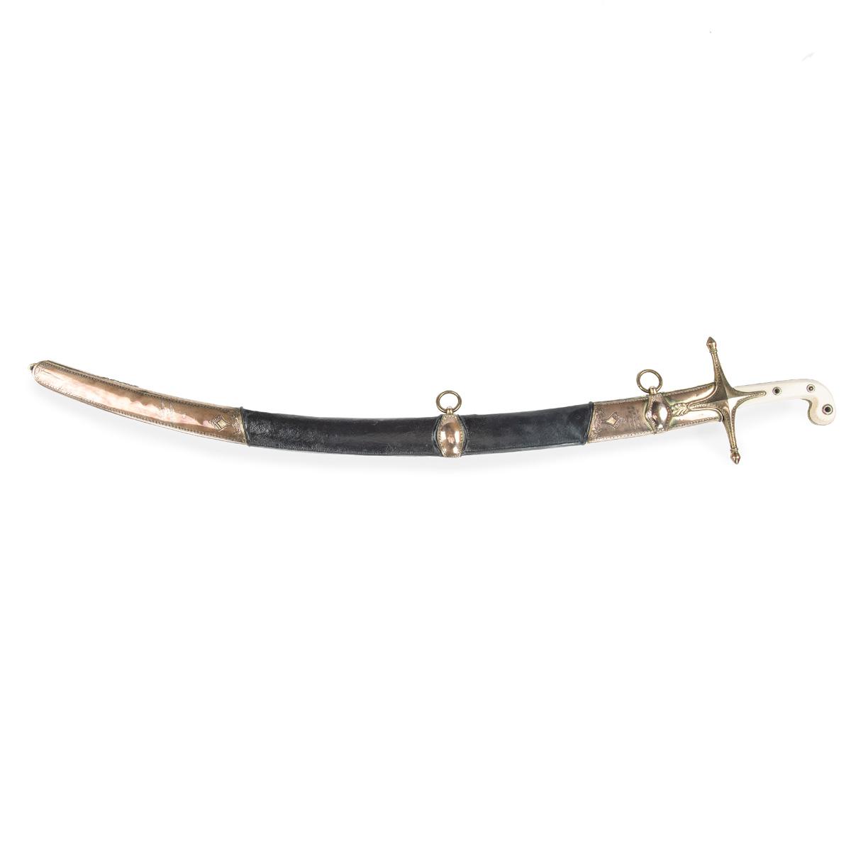 Of early 19th century date, this sword was made in the so-called Mameluke style. The blade is flat with a false edge. The grip is of bone and gilt brass is employed in the construction of the langet and cross guard. The scabbard has gilt brass fittings, all profusely engraved and decorated. The engraving includes much of the provenance of this piece including: