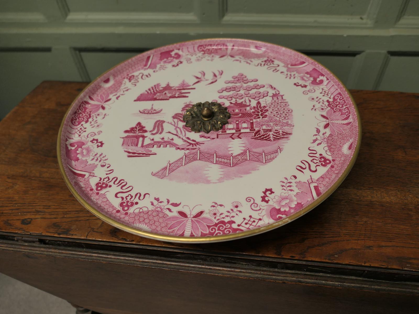 A superb large dinner party size piece, most unusually this piece is in Red and White Willow Pattern with a gold rim around the edge, the comport has a very well designed stand in wood and brass all in very smooth working order