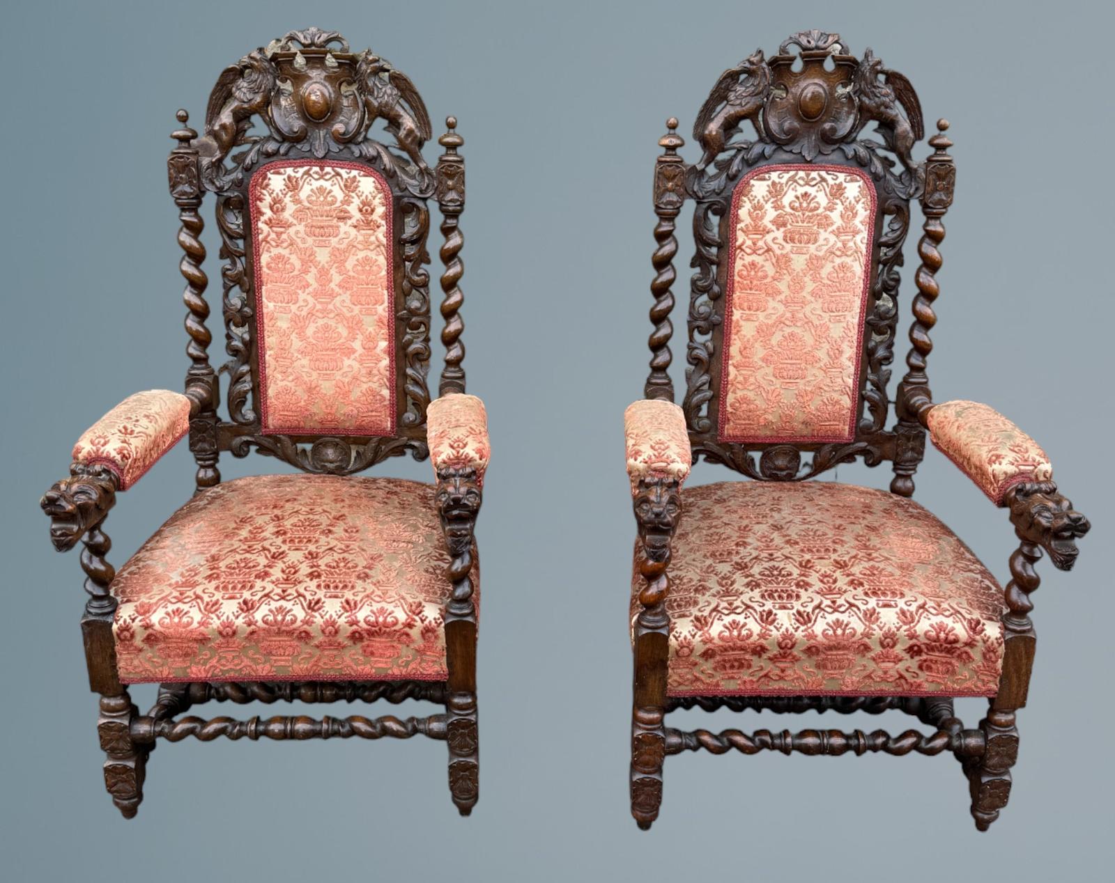 A Large and Impressive Pair of 19th Century Carved Oak Jacobean Style Armchairs