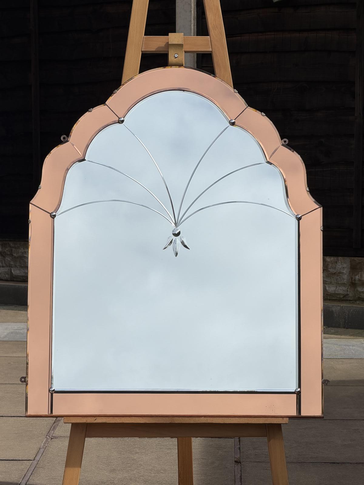 The 6 coloured mirrored pieces make up a frame for the frameless mirror . Each piece has a good bevelled edge all round, the side and the bottom are rectangular in shape, whilst the top part of the mirror forms, the cloud shape, a traditional design from the period.