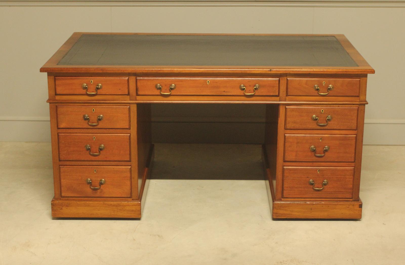 Showcasing timeless elegance, this large mahogany kneehole pedestal desk is crafted in three parts and features beautifully panelled sides. The blind-tooled black leather top adds a touch of sophistication, while the nine drawers provide ample storage. Finished with swan neck brass handles, each drawer has been meticulously oiled and waxed to ensure smooth and effortless operation. A perfect blend of classic design and practical functionality.