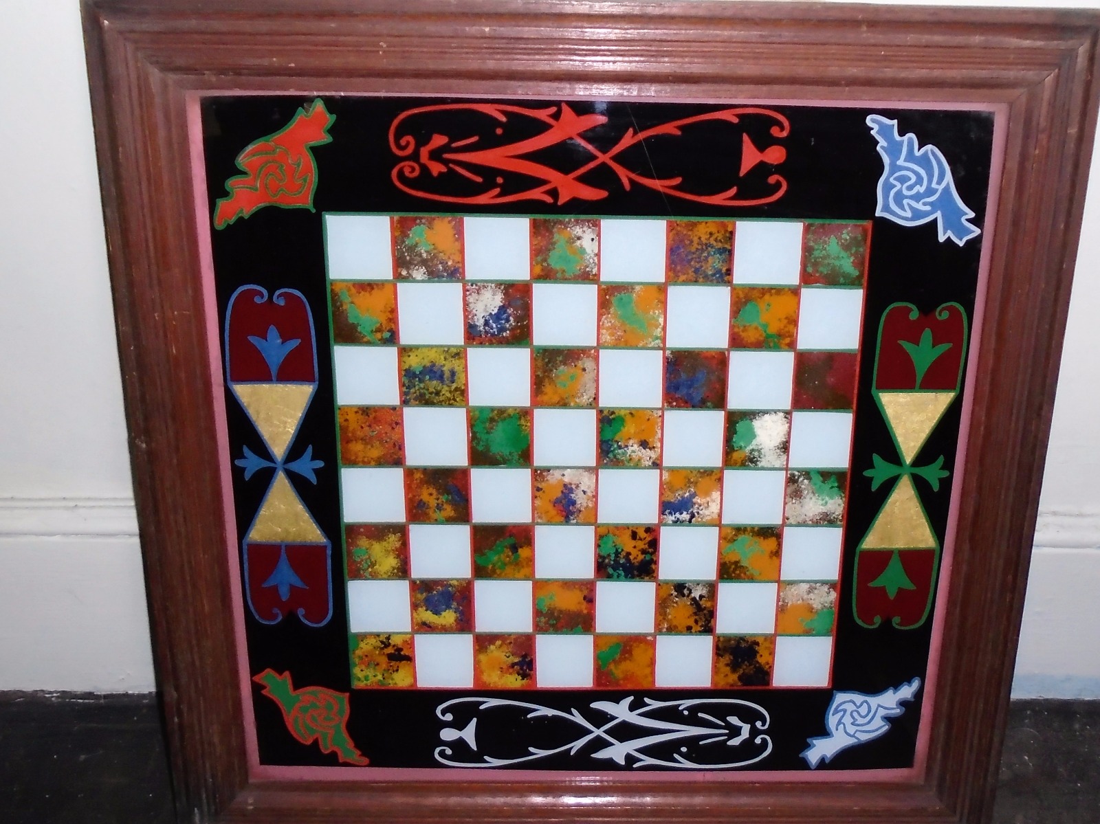 A Late Victorian Verre Eglomise or Reverse Painted & Gilded Glass Tavern Chessboard or Games Board Chess