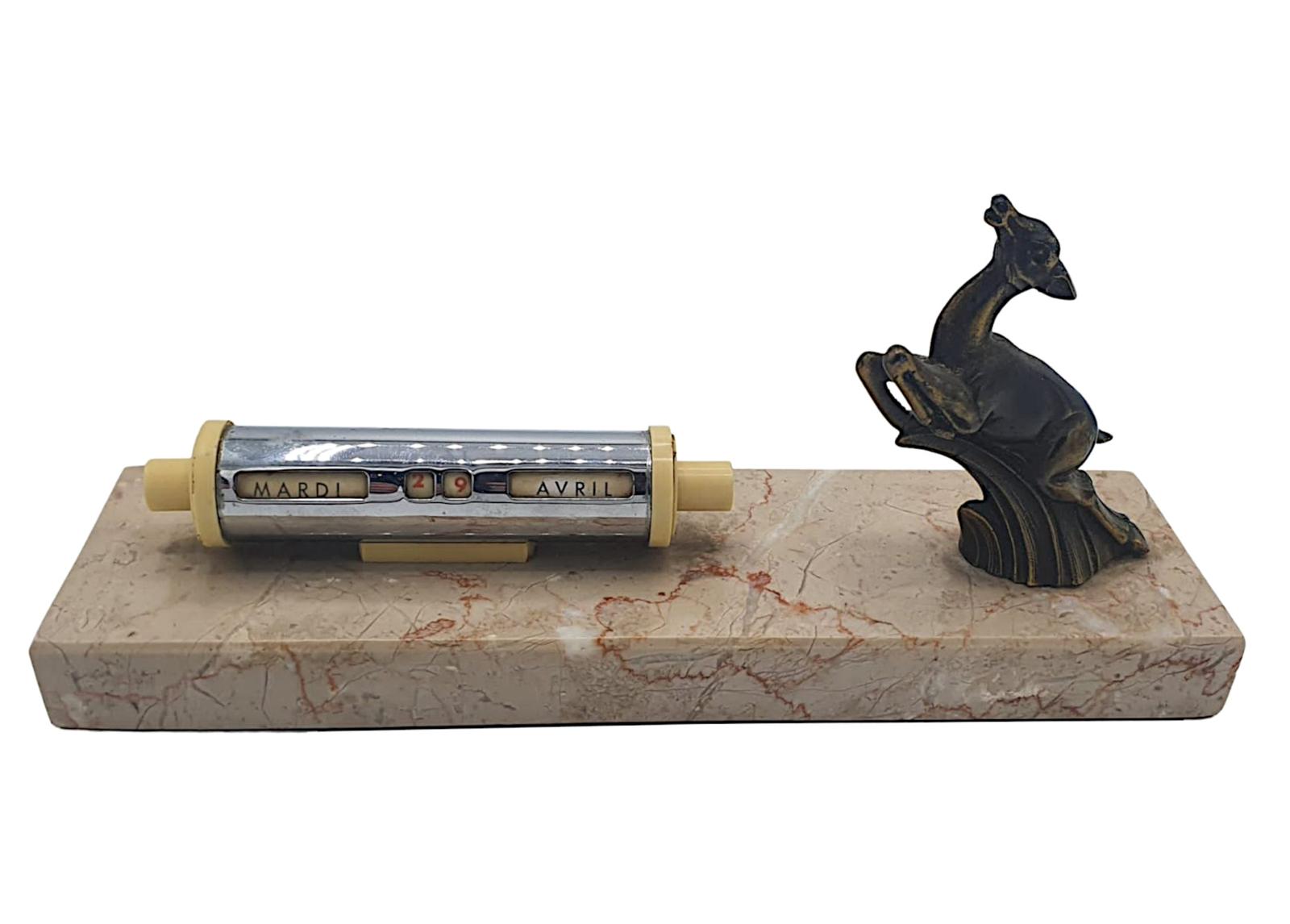 A Lovely French Art Deco Perpetual Desk Calendar with a Bronze Leaping Deer