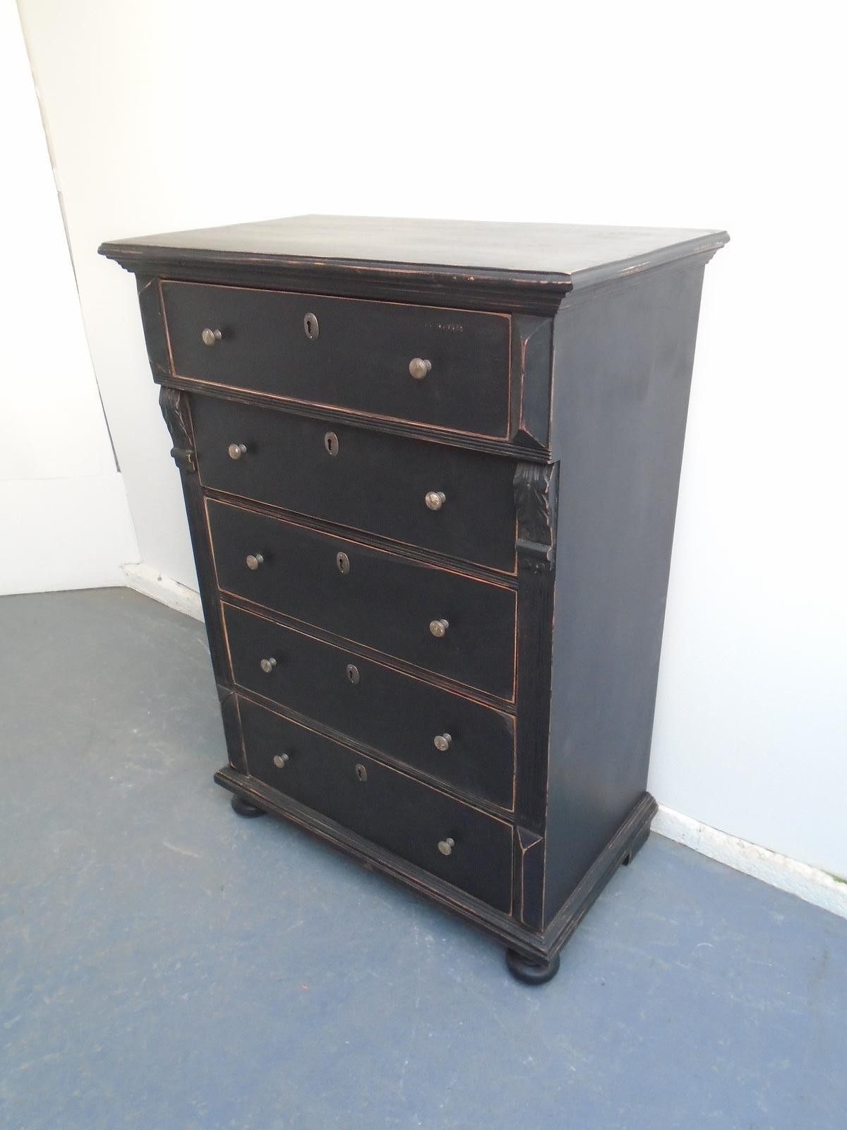 A Lovely Narrow Painted Black Victorian Antique Pine 5 Drawer Chest of Drawers