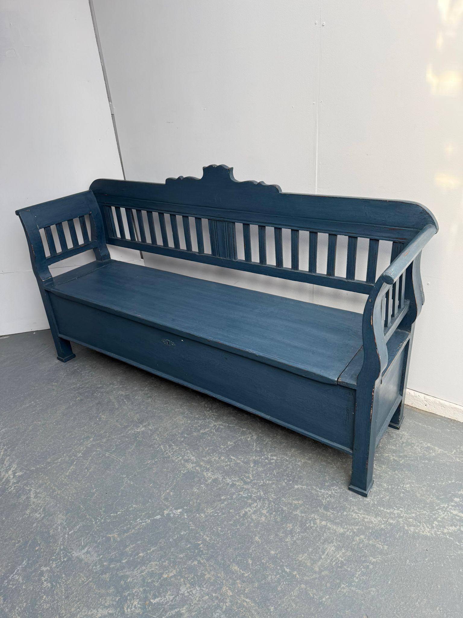 A Lovely Painted Blue Original Victorian Pine Hungarian 3seater Box Settle Bench