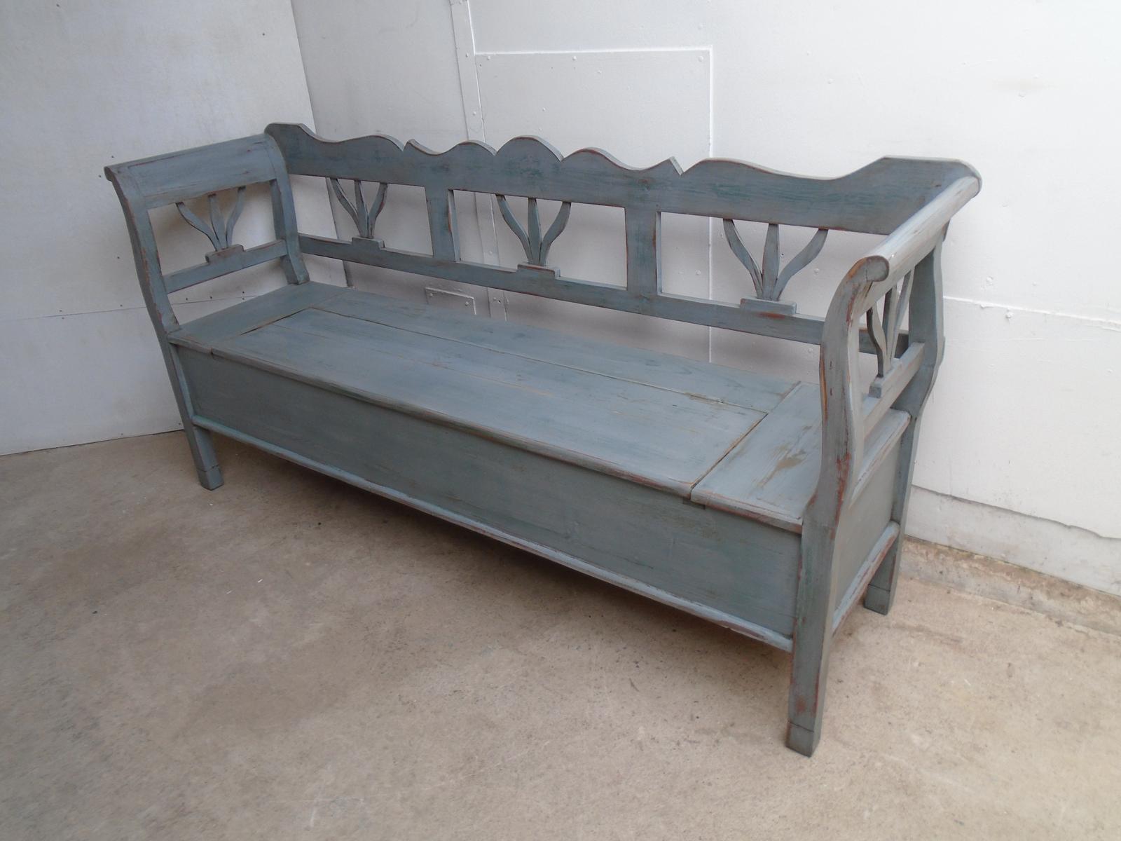 A Lovely Painted Grey & Green Antique / Old Pine 3 Seater Box Settle / Bench