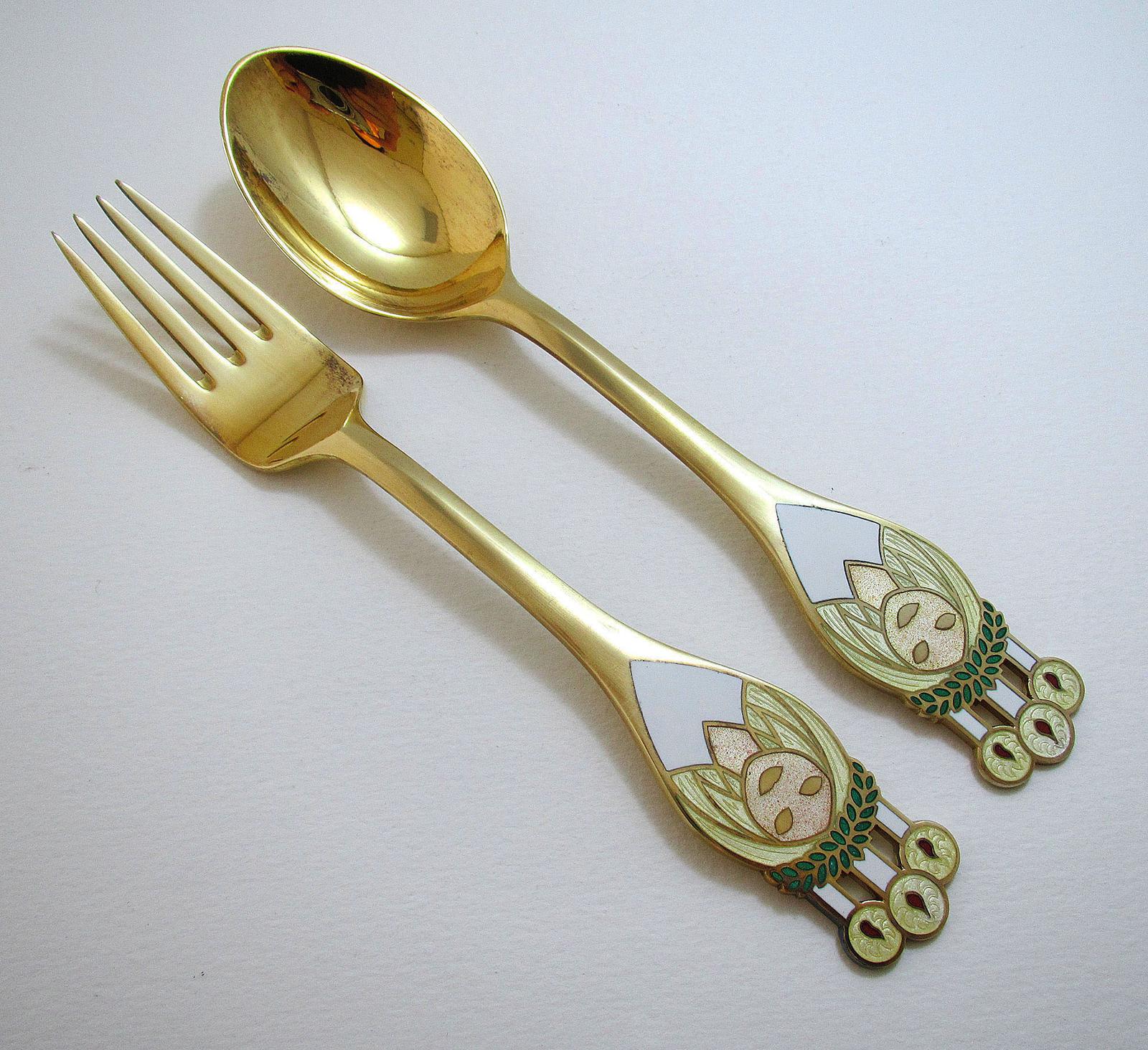 A Michelsen Danish Solid Sterling Silver Enamel, Christmas 1959 Spoon & Fork Pair Set. Lucia Bride (1 of 7)