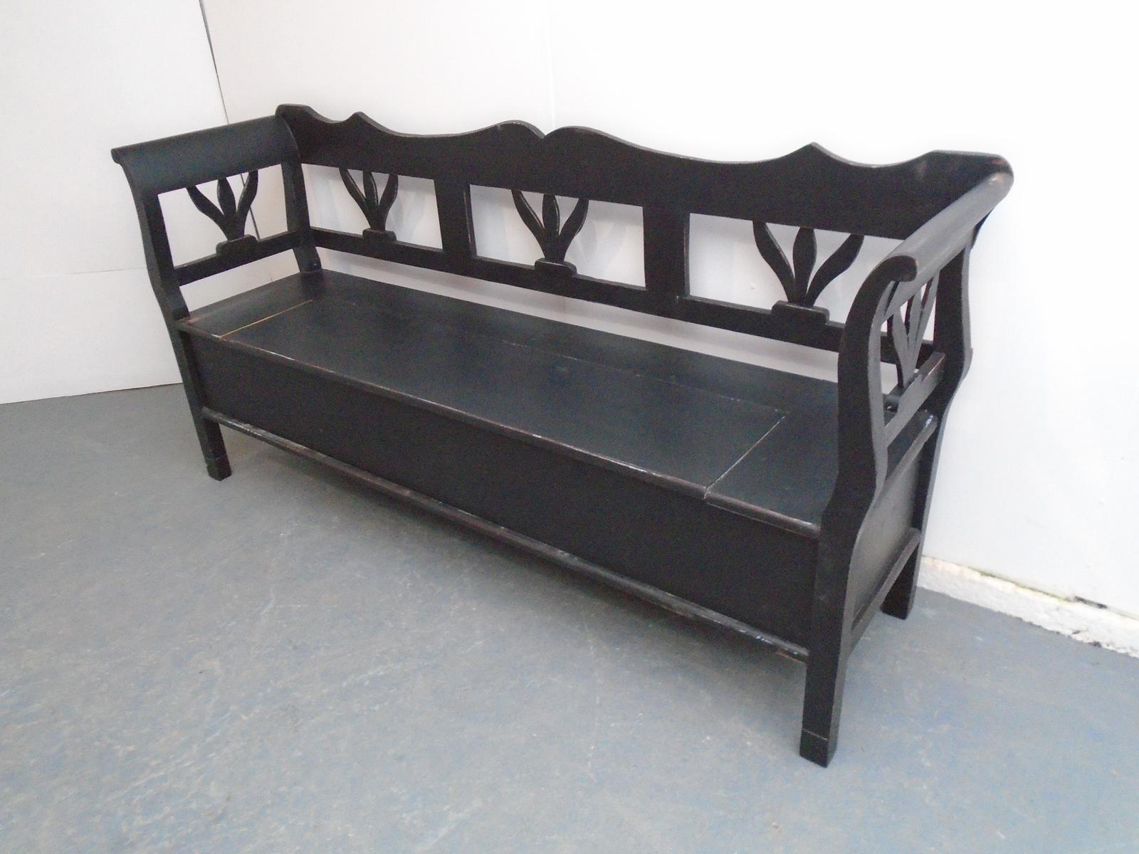 A Painted Black Tulip Antique / Old Pine 3 Seater Box Settle / Bench