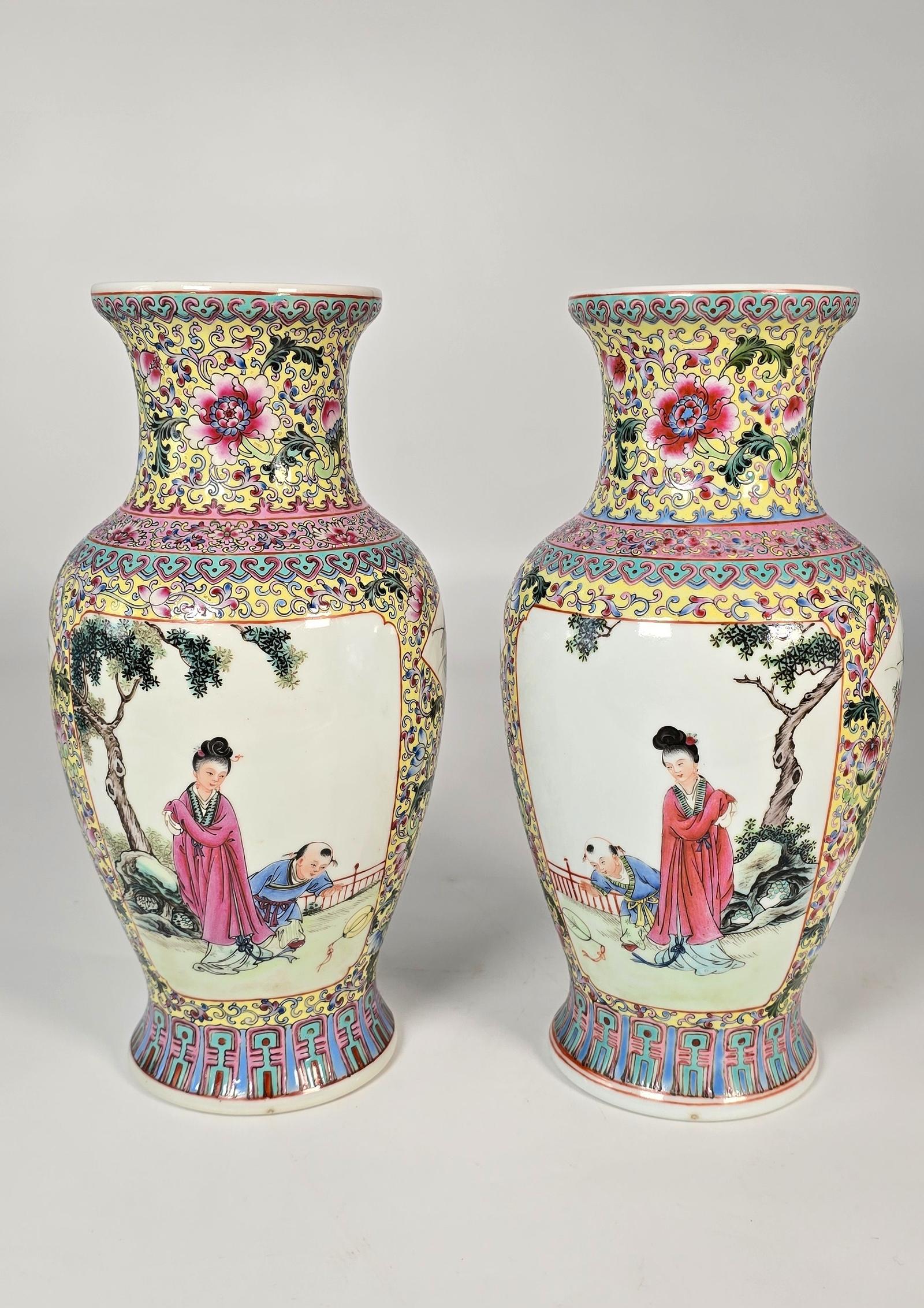 This beautiful and high quality pair of Chinese hand painted and enamelled porcelain vases are from the Republican period, early to mid 20th century. These superb hand painted and richly famille jaune enamelled pair of vases are highly detailed with six hand painted panels on each vase. The large front and reverse panels show a mother and her young son playing with a kite or balloon. (The painted images are reversed, making the vases true left and hand righted pair). The sides of each vase have two panels with insects and flora. The remaining surfaces are wonderfully enamelled in a rich palette of colours with an intricate, continuous pattern of foliage and flowers woven together with tightly repeated scroll work on a pale yellow ground. This continual decoration is divided with intricate coloured boarders in turquoise and rose pink with fine, delicate hand painted patterns. The vases are fully signed with bold red character marks on their bases. Both vases are in perfect condition apart from both slight imperfections to the foot rim with small losses to the glaze where they have been spaced in the kiln with bamboo sticks as part of their manufacture. The details are shown in the photographs. The pair of vases and their marks are very similar to examples in a good book on Chinese porcelain from the 19th and 20th centuries entitled From the Dragon's Treasure, where on page 144, illustration number 194 shows a similar decorated vase and in the illustrated marks number 197 is identical. Both relate to Republican period pieces. Chinese, Republican period (1911 - 1949)