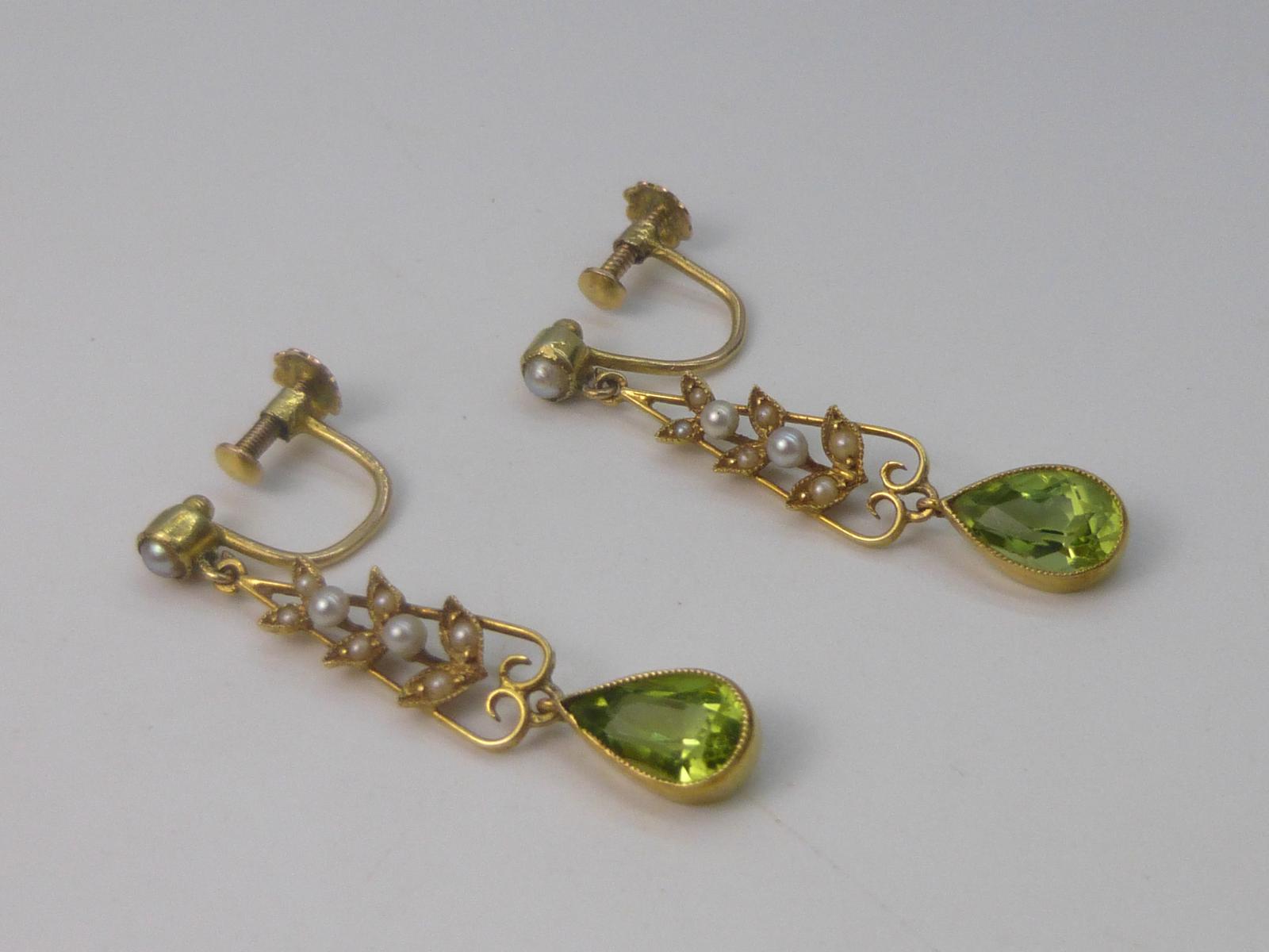 A Pair of Edwardian Gold, Peridot and Seed Pearl Earrings