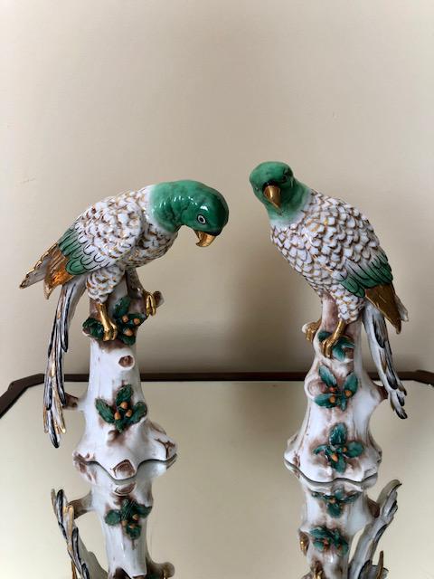 A Pair of French Antique Porcelain Parrots on Tree Stumps By Edme Samson, Paris