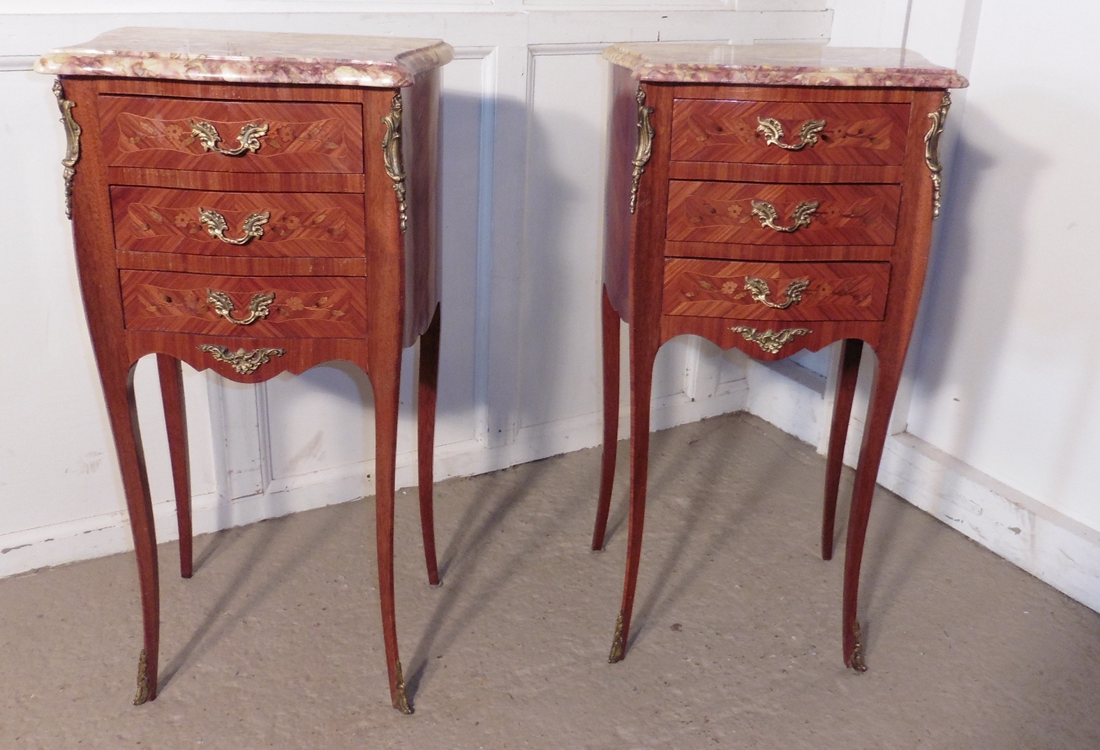 A Pair of Inlaid French Marquetry and Marble Bedside Cupboards