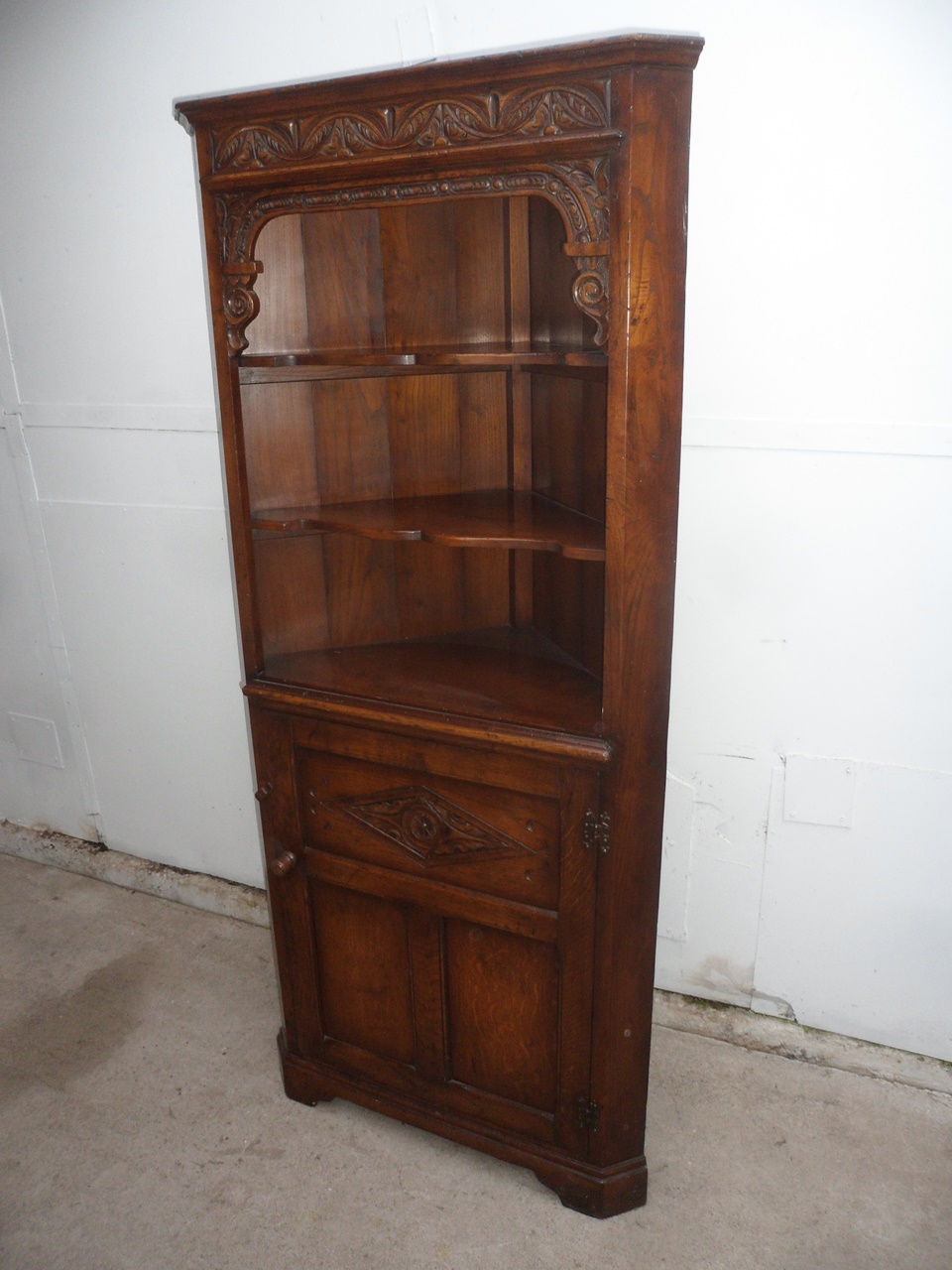 A Quality 1920s Solid Golden Oak Carved Corner Cabinet