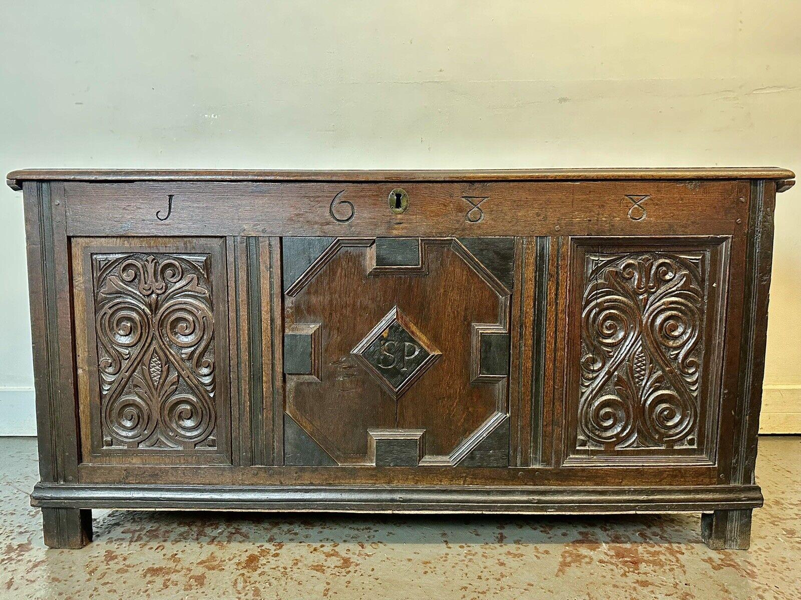 A Rare & Beautiful 300 Year Old Antique Oak Carved Coffer. Dated C1688