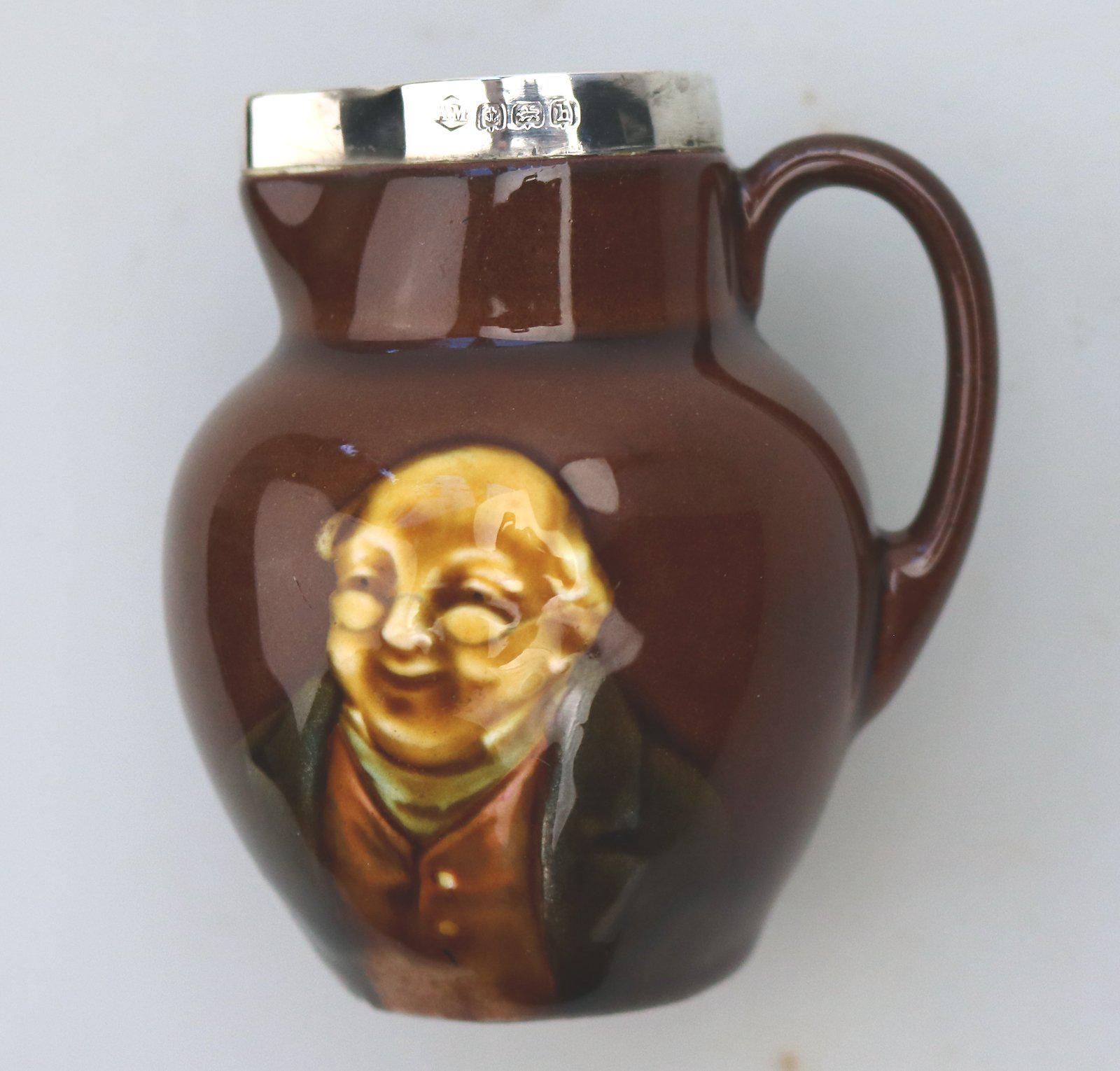 A Royal Doulton Miniature Mr Pickwick Small Kingsware Jug Solid Silver C.1907