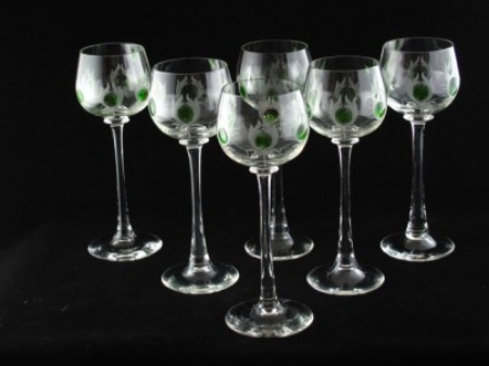 A Set of 6 Art Nouveau Bohemian Peacock Wine Glasses by Harrach c.1900
