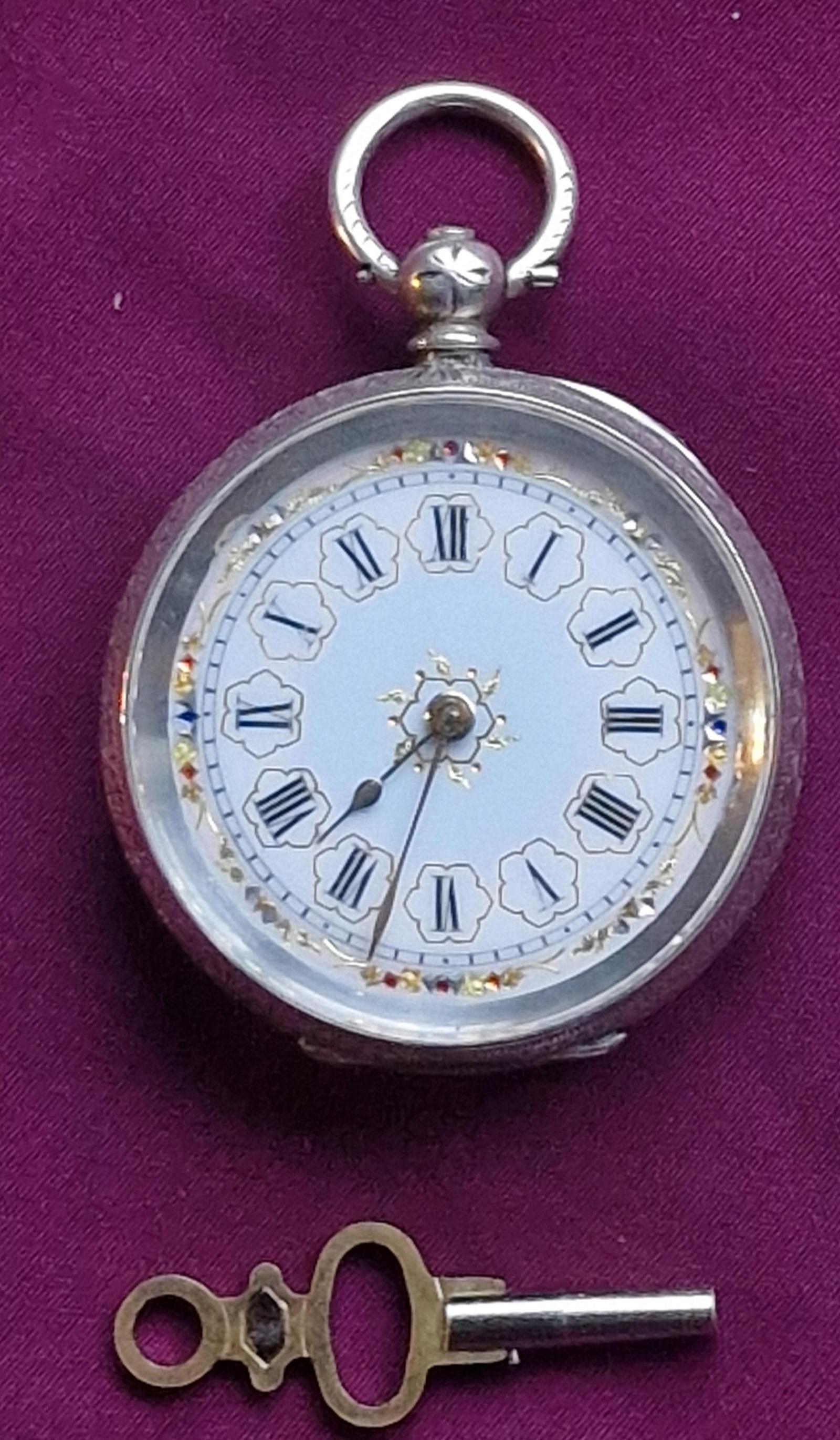 A Swiss silver pocket watch. A lovely enamel dial with multicoloured decorations and blued steel hands. Engraving to the case back and sides. A key wind mechanism. Circa 1895.