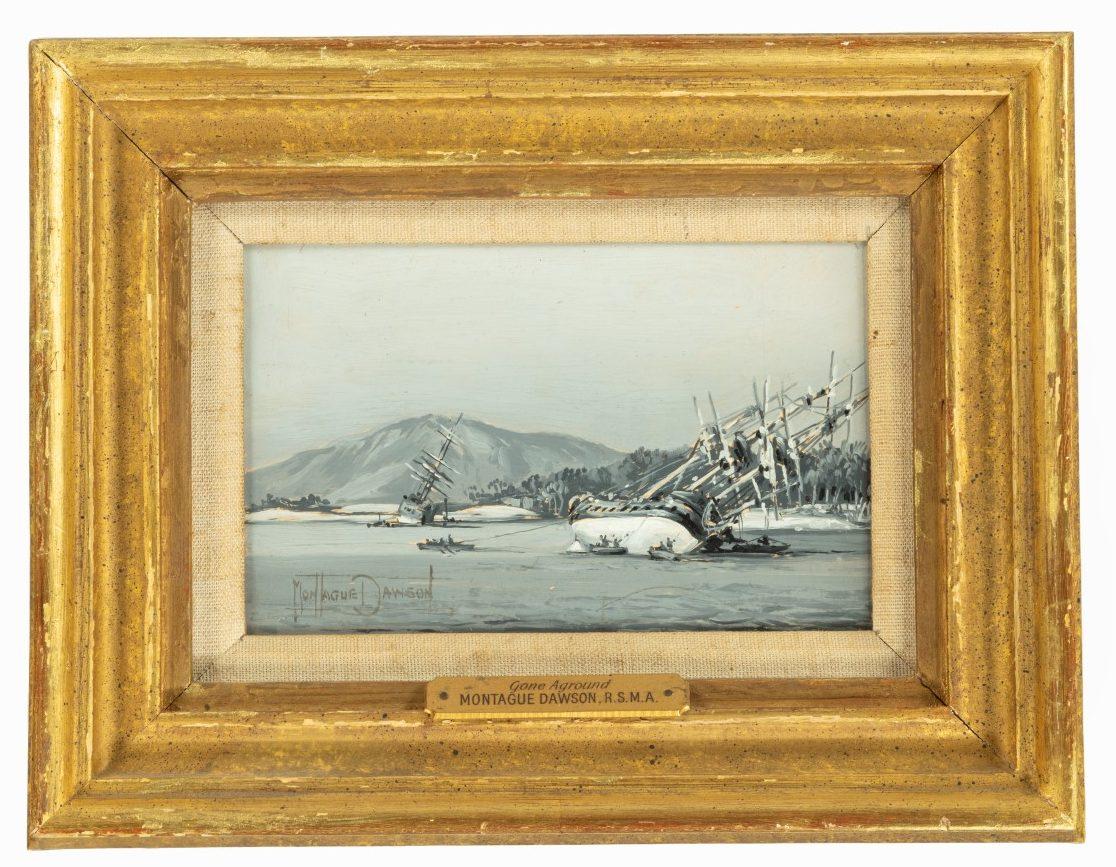 A Small Montague Dawson Oil on Panel of Ships Being Careened, Dated 1960 (1 of 2)