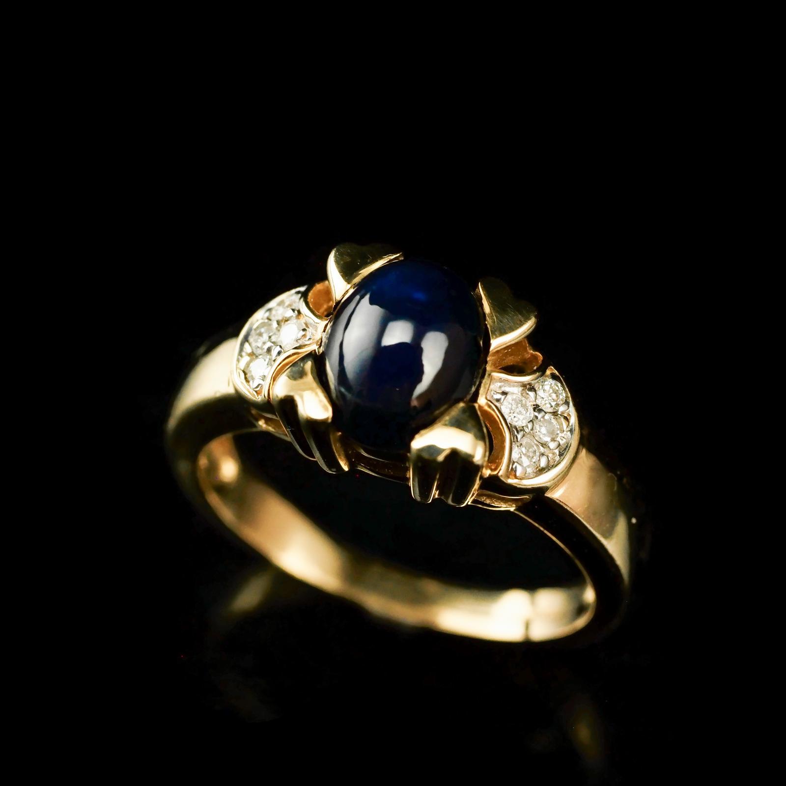 A Stylish Vintage 9K Gold Sapphire Cabochon and Diamond Ring
