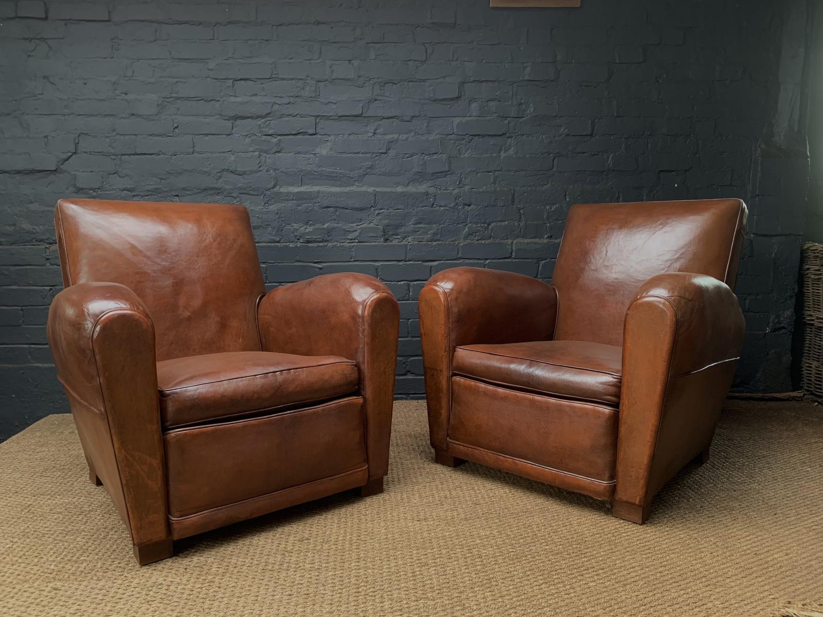 A Superb and Rare Pair of 1920's French Leather Club Chairs, Art Deco Models
