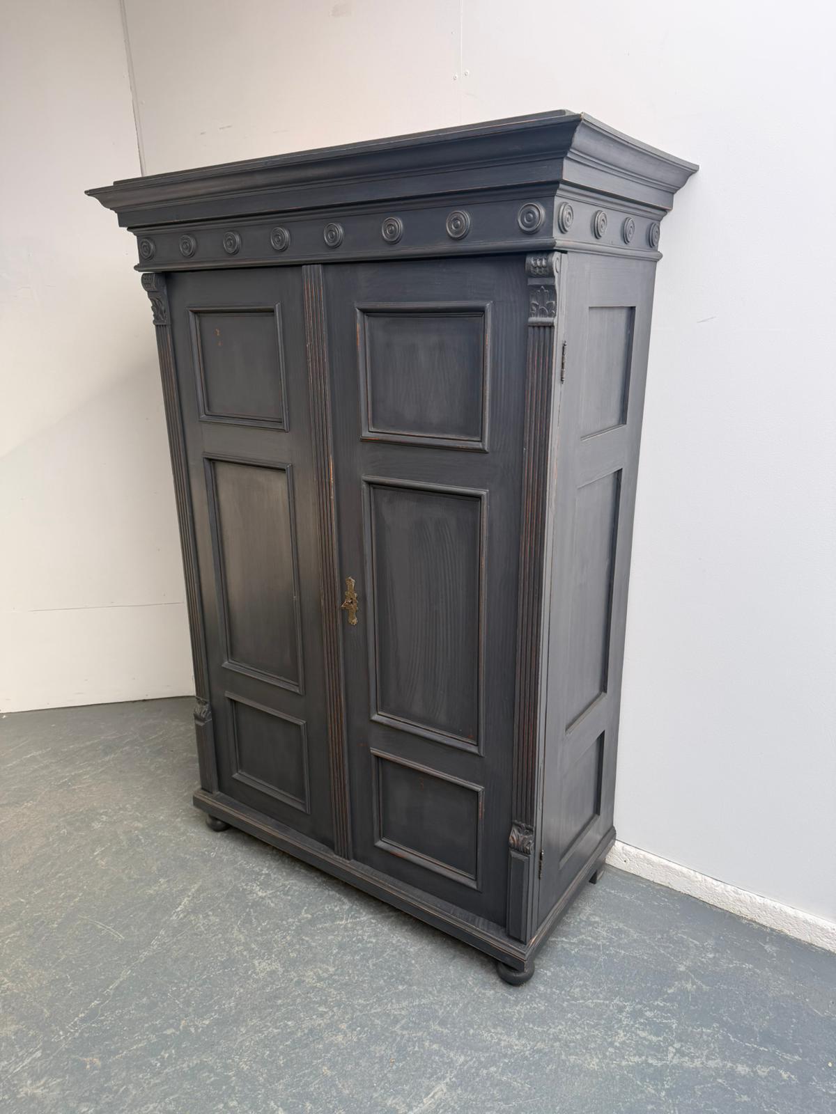 A Superb Painted Mid Grey Victorian 1 Piece Panelled Antique Pine Hall Wardrobe
