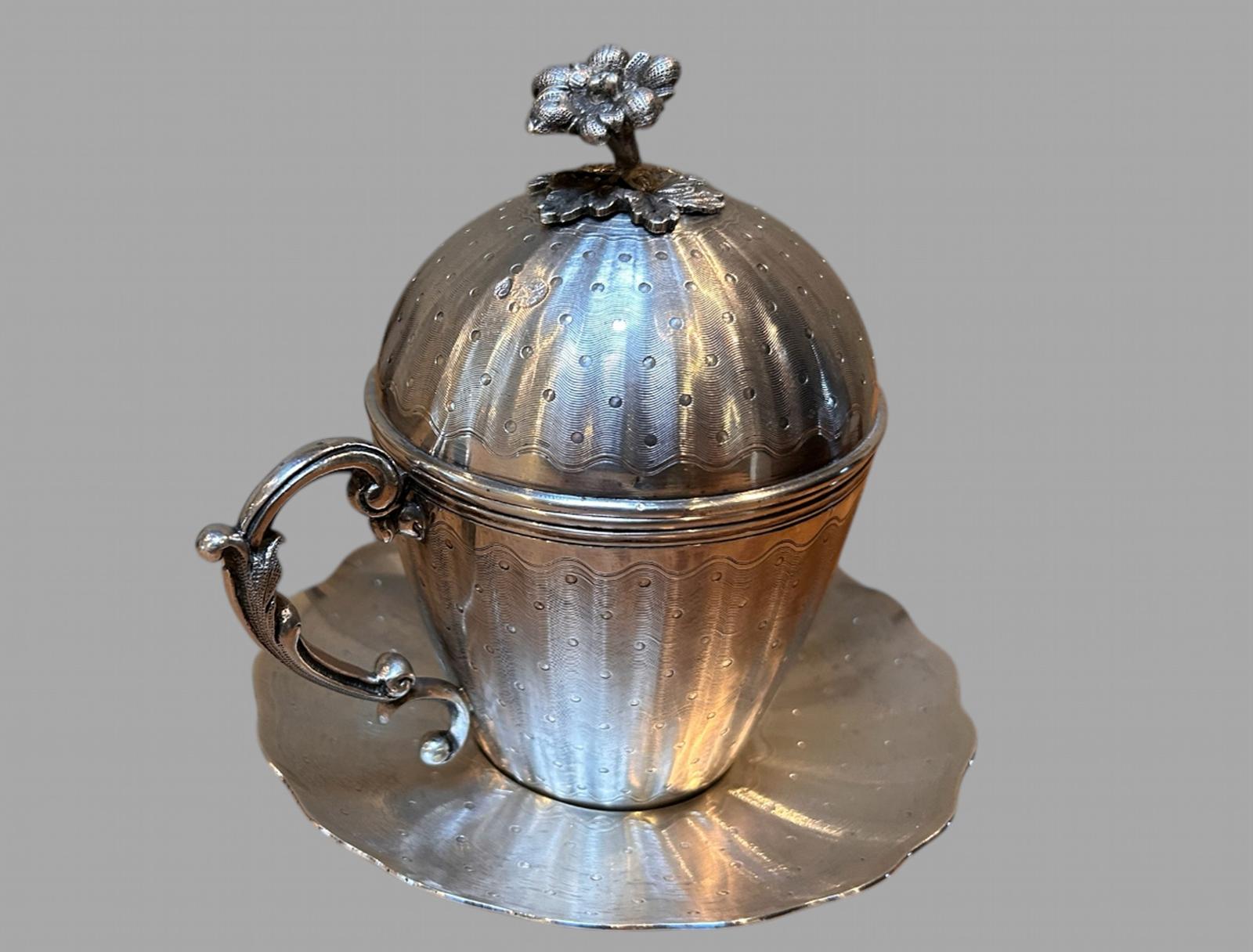 A Turkish Silver Cup with Decorative Lid and Saucer C1900