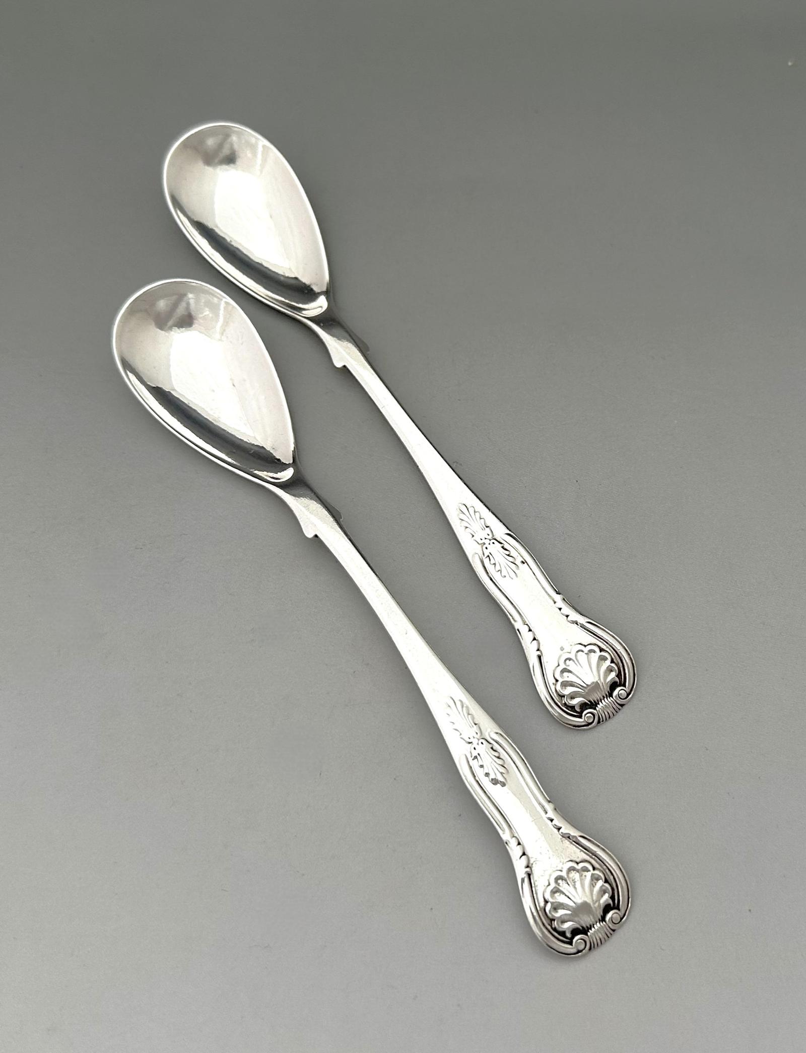 A useful pair of silver mustard spoons, assayed in Edinburgh. These charming matching spoons are Victorian in date and are made by the collectable silversmiths of Hamilton & Inches. Each spoon is single struck (pattern to front only) in the popular Kings pattern and are of good gauge silver. A great addition to any collection.