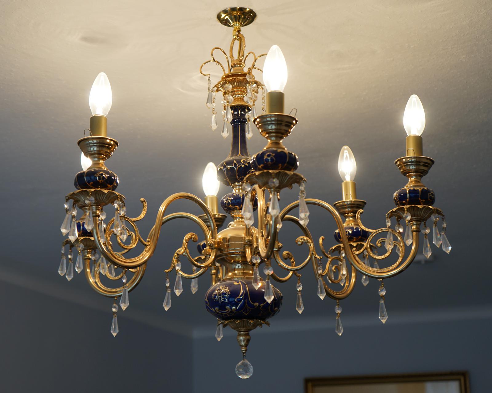 A Vintage Ornate Cobalt Blue 24k Gold Porcelain & Brass Crystal Chandelier (1 of 6)