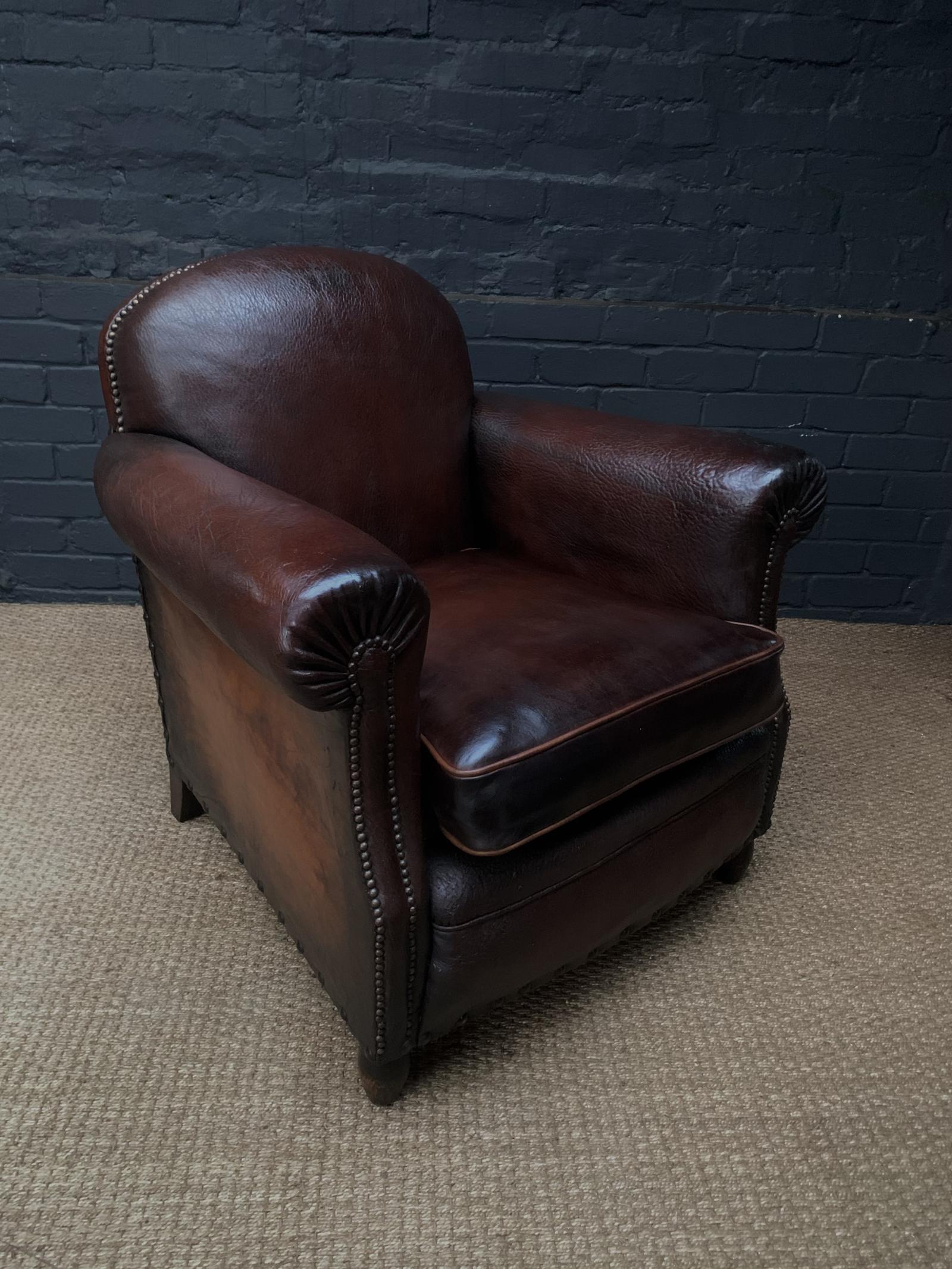 A Wonderful French Leather Club Chair Normandy Round-back Model, with Turned Walnut Feet C1910-30 (1 of 10)