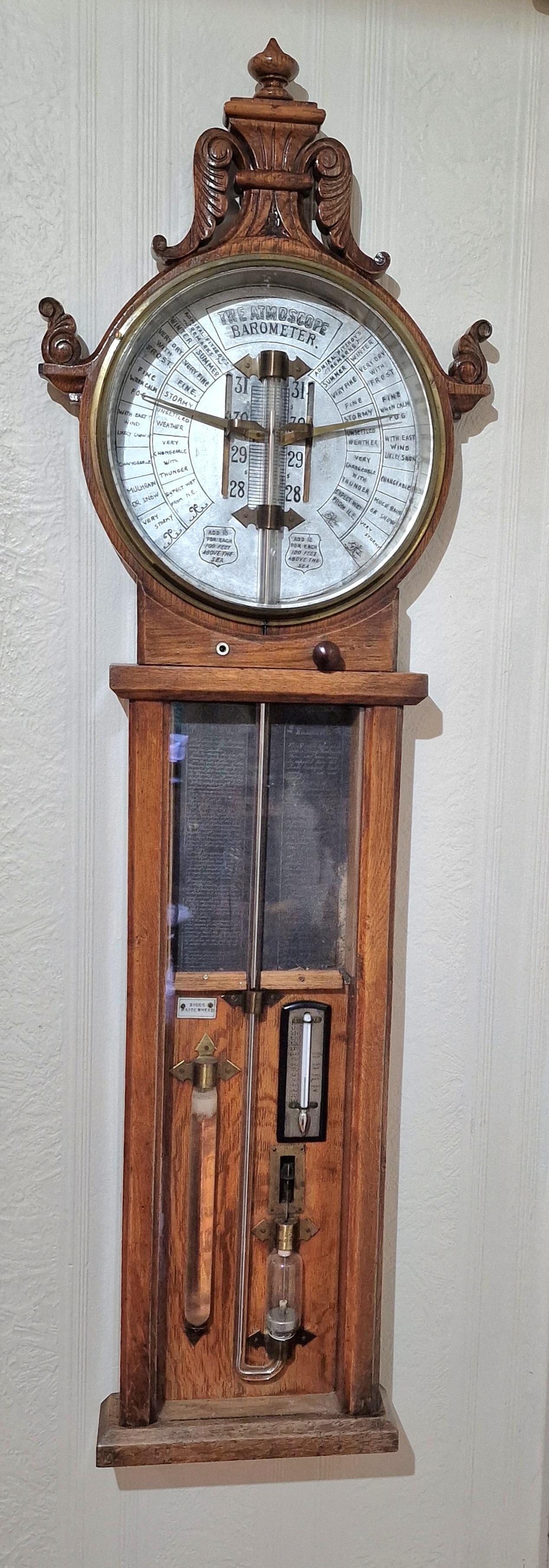 An impressive Victorian Admiral Fitzroy 'The Atmoscope' barometer. A golden oak case with the original carving to the pediment and sides. Twin vernier sliding scale adjusters. Twin dials with weather predictions and 28 to 31" and a large bore mercury tube.